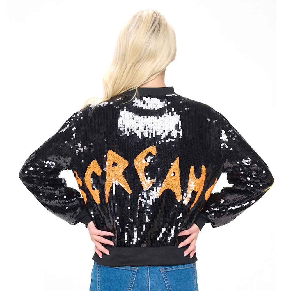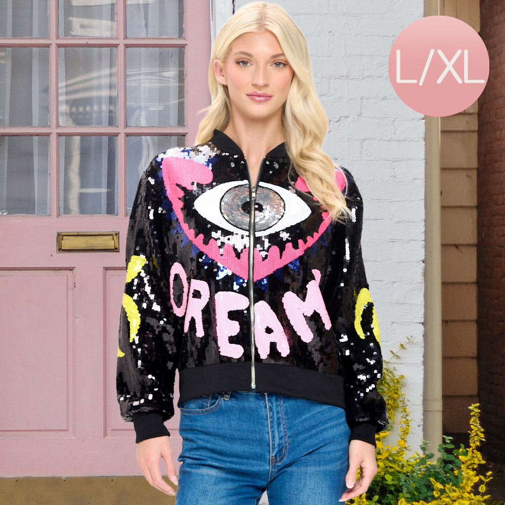 Dreams Screams Letter Multicolor Eye Sequin Zip Up Bomber Jacket