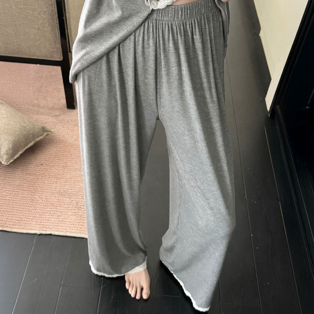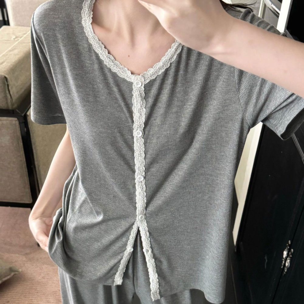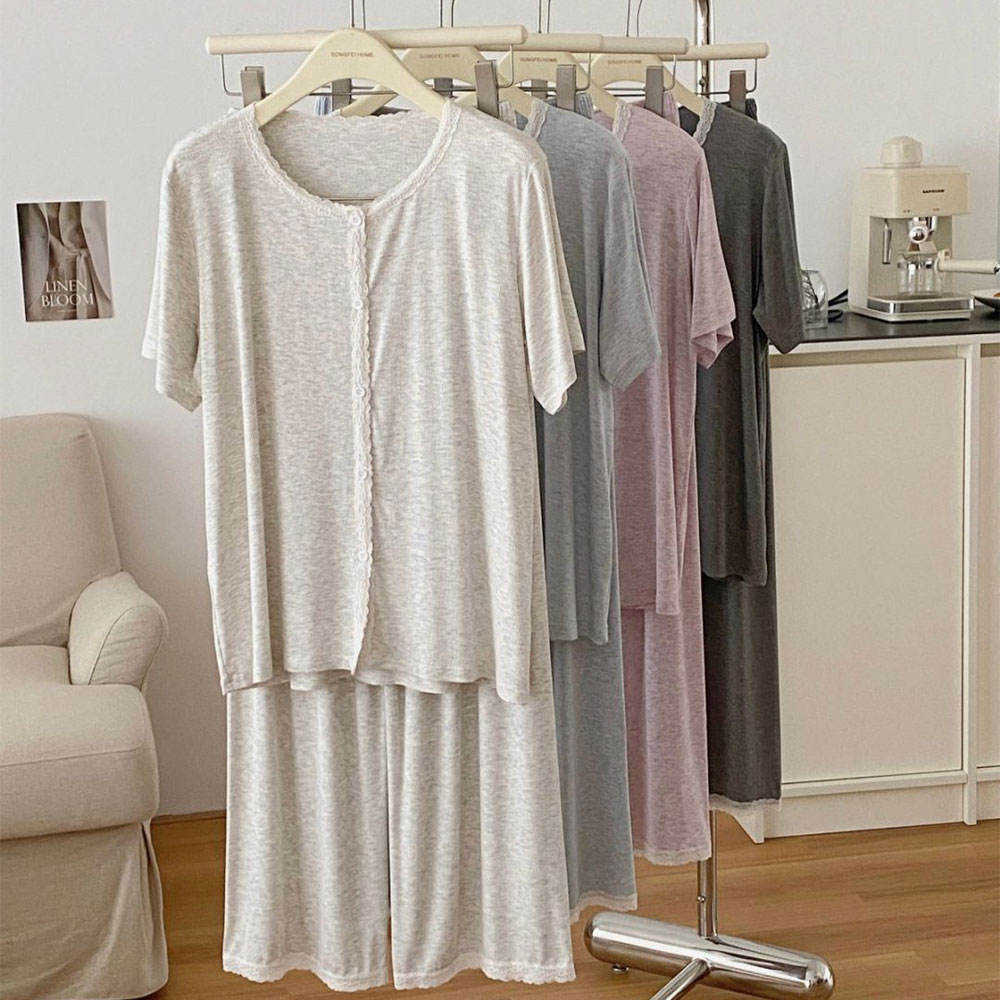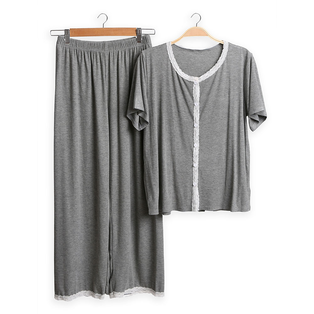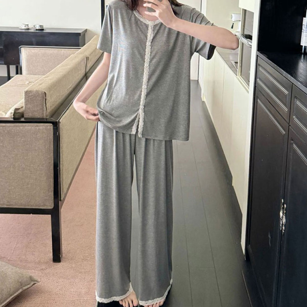 Details • Size : One Size • Material : 93.5% Viscose, 6.5% Spandex • Features : lace trim • Relax in effortless comfort with this soft knit pajama set featuring a short sleeve button-front top and flowy wide-leg pants. Lightweight and breathable, it's perfect for lounging, sleeping, or casual days at home. Stretch waistband ensures a comfy fit. Ideal for year-round wear • Care : do not bleach, iron on low heat, dry clean, tumble dry low, hang dry, separate washing • **Please note, actual colors may vary slightly from what you see on your screen