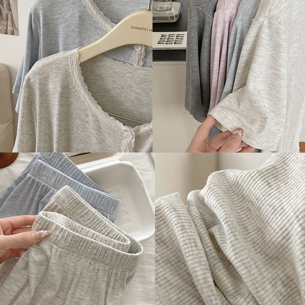 Lace Trim Short Sleeves Top Pants Loungewear Pajama Set