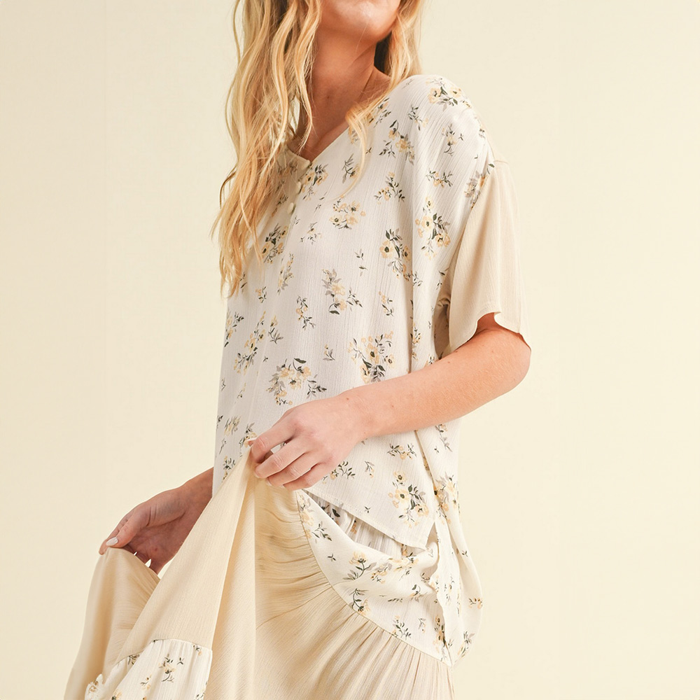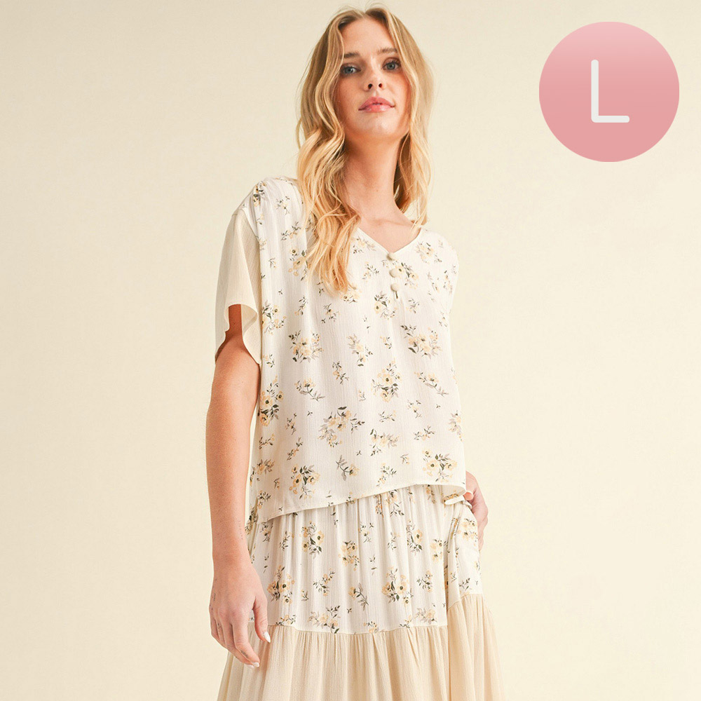 Details • Size : Large • Designed to look cute, stylish, and ready for Summer! Wear this gem with any matching skirt or throw on a pair of jeans and you will be a hit! • • Short sleeves • 3 Buttons • Floral design • Lightweight • Flowy • Pullover styling • Imported • Material : 100% Rayon • Care Instructions: Machine wash cold, Do Not Bleach, Drip dry, Iron Low