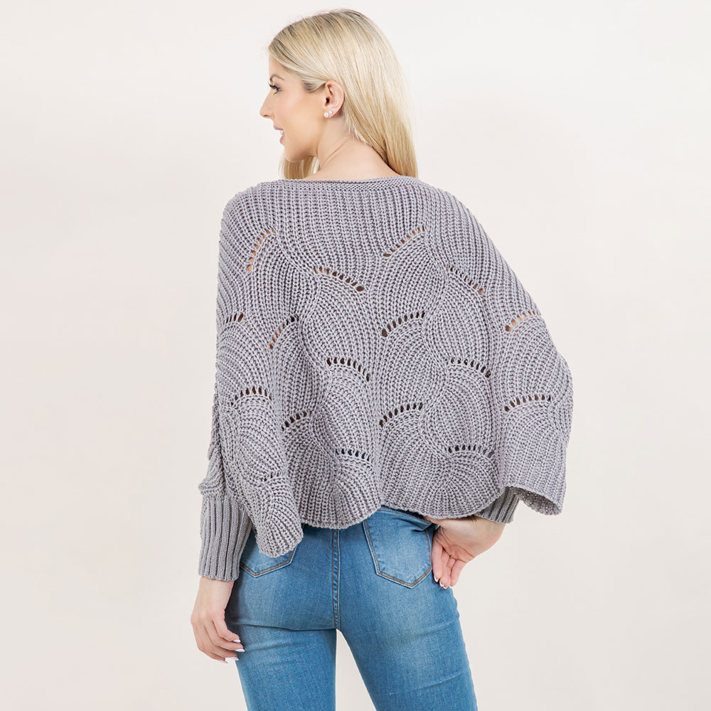 • Relaxed and chic, this loose knit batwing sweater features a textured openwork pattern and wide sleeves for an effortlessly cozy yet stylish fit. Ideal for layering and adding a unique touch to any casual or dressed-up outfit.