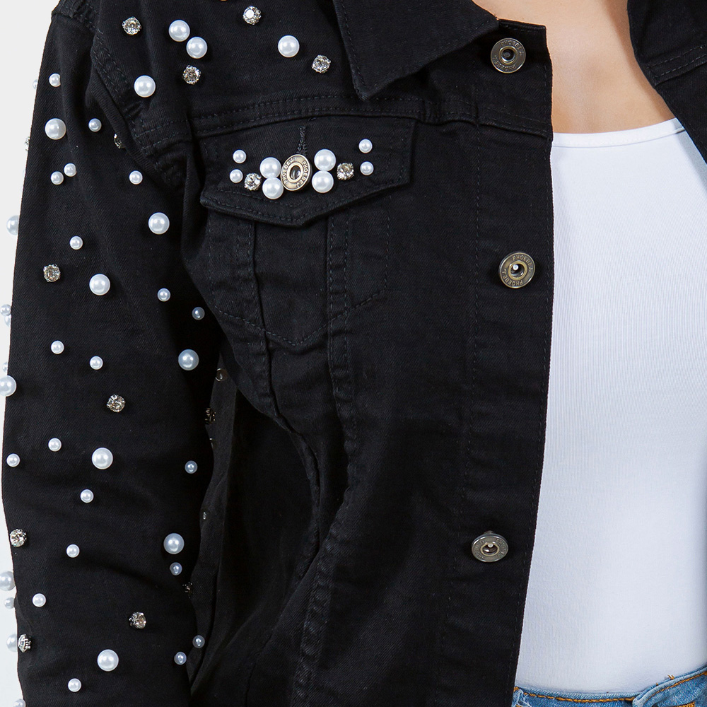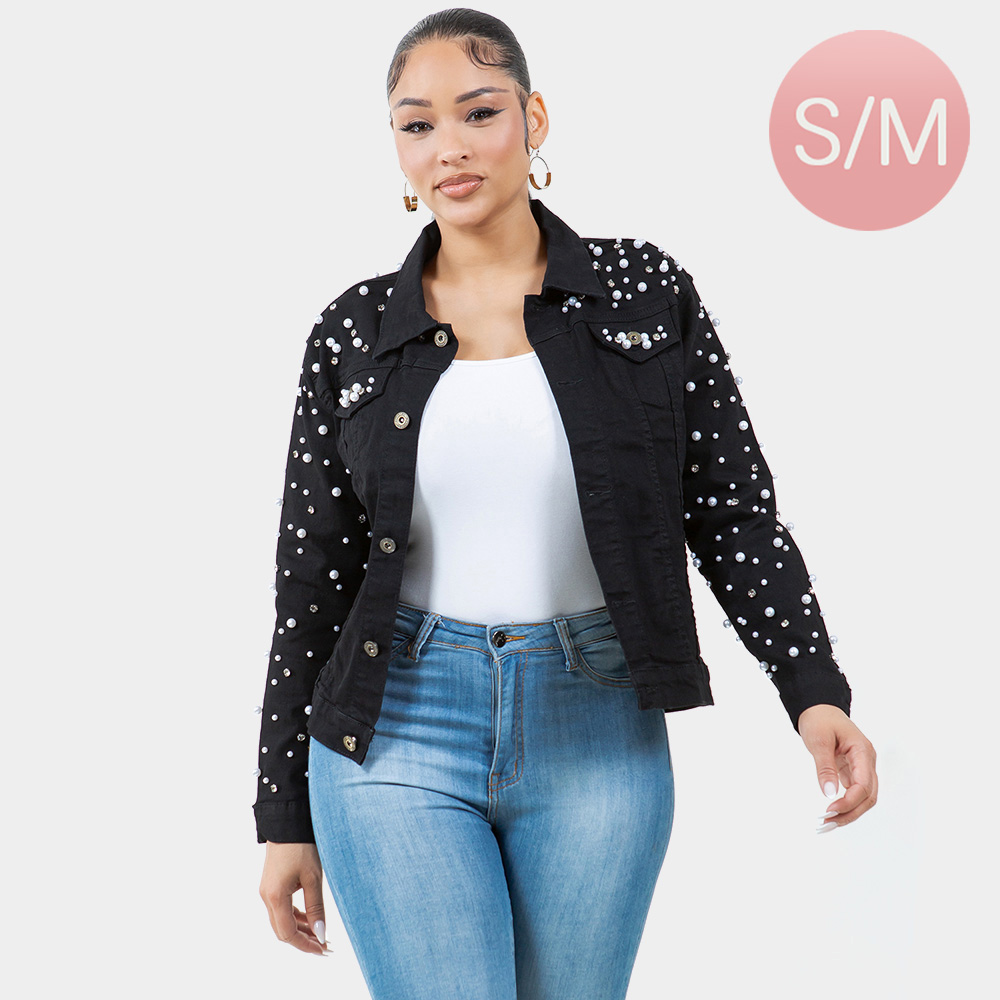 Details • Size : S/M (48"W, 58" L) • Material : 67% Cotton, 20% Polyester, 11% Rayon, 2% Spandex • Trendy button-up denim jacket with allover stud detailing for a bold, eye-catching finish. Featuring front pockets and a classic collar, this stylish outerwear piece adds edgy flair to casual outfits. Available in multiple sizes for a flattering, confident fit.
