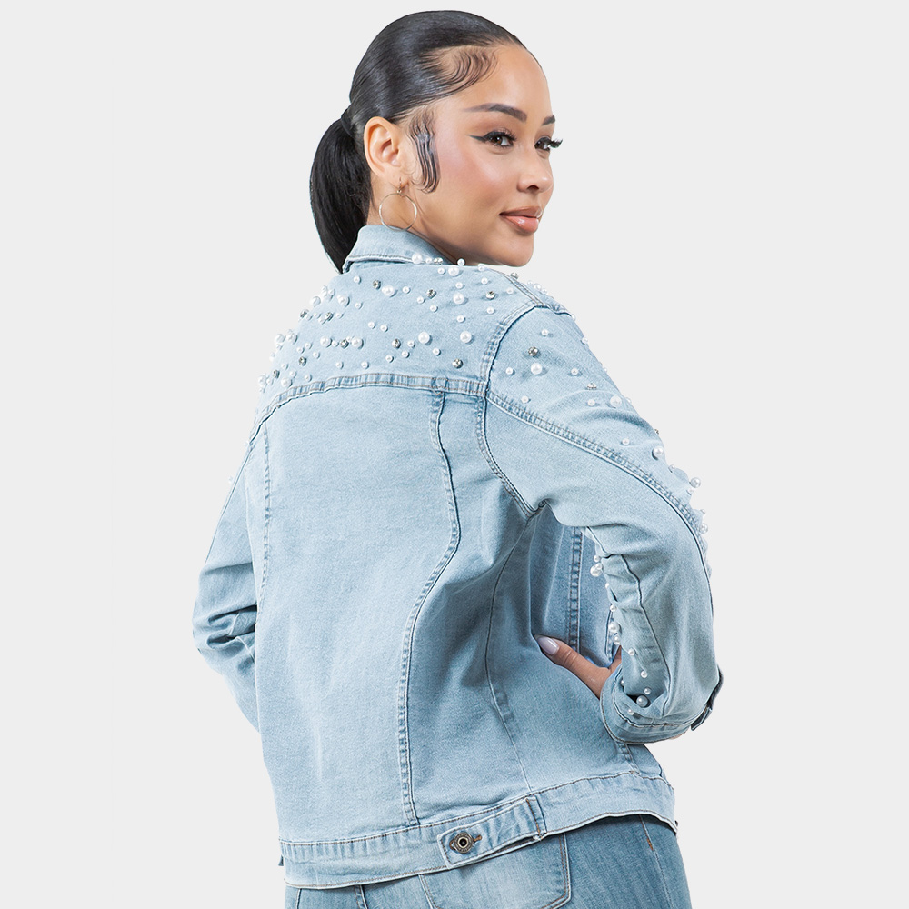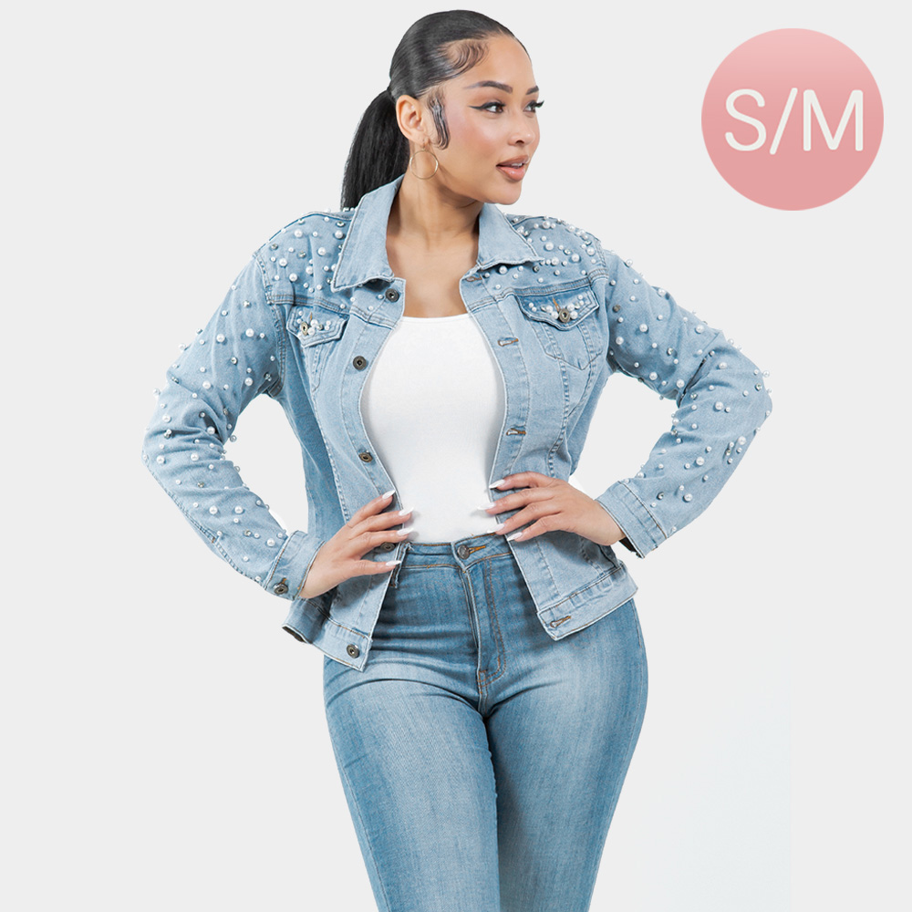 Details • Size : S/M (48"W, 58" L) • Material : 67% Cotton, 20% Polyester, 11% Rayon, 2% Spandex • Trendy button-up denim jacket with allover stud detailing for a bold, eye-catching finish. Featuring front pockets and a classic collar, this stylish outerwear piece adds edgy flair to casual outfits. Available in multiple sizes for a flattering, confident fit.