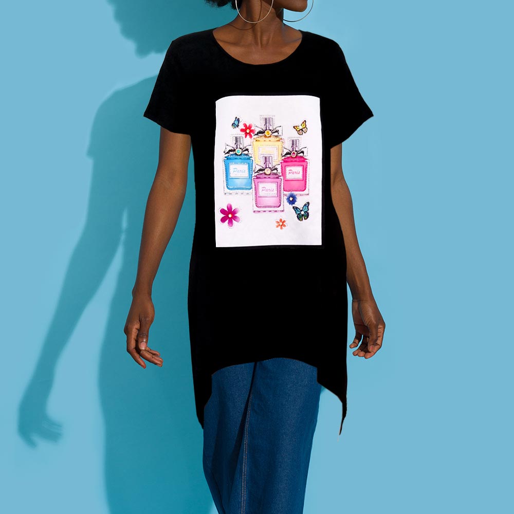 Perfume Butterfly Flower Printed Crystal Embellished Half Sleeve Top