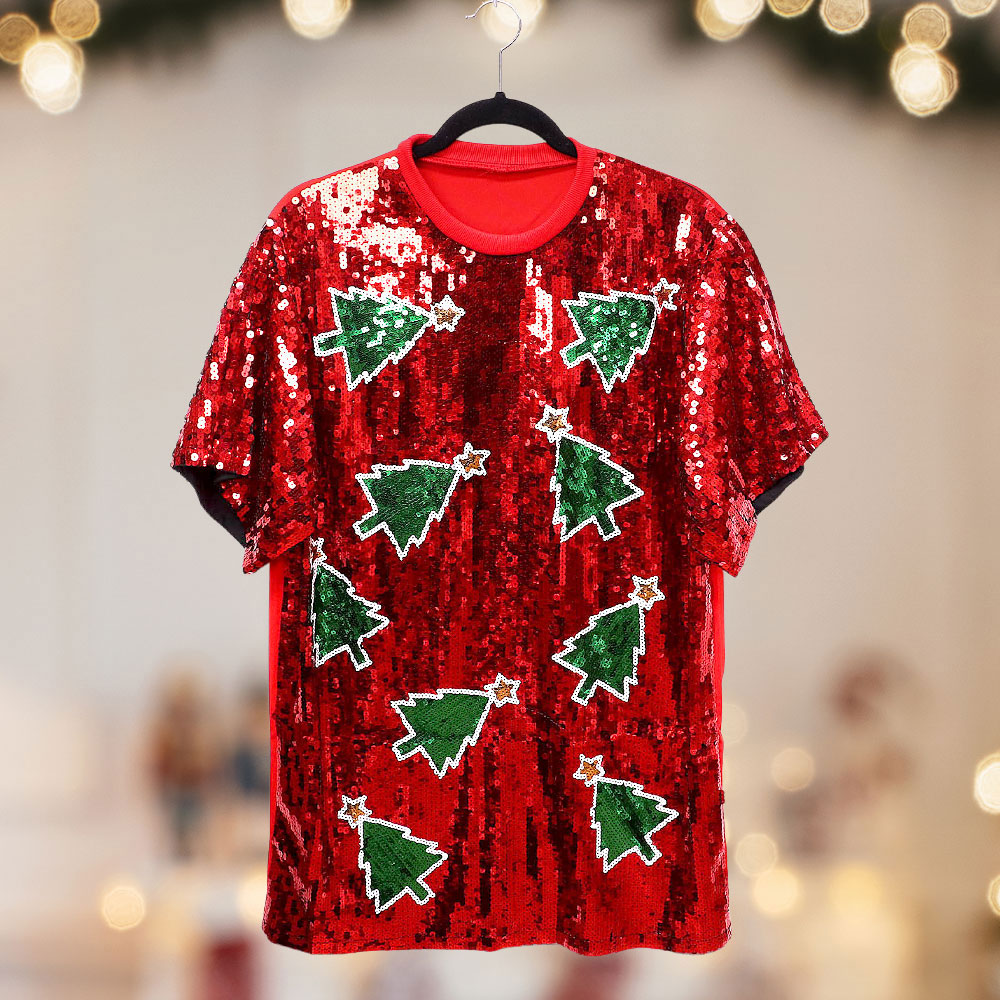 Details • Size : Plus Size • Bust Size : 48" - 50" L, Length : 31" L • Material : 100% Polyester • Sparkle with seasonal charm in this plus size sequin Christmas tree dress, featuring playful holiday motifs and a shimmering finish. Perfect for Christmas parties, family gatherings, or festive photos, this cheerful dress brings joy and holiday spirit to every celebration.