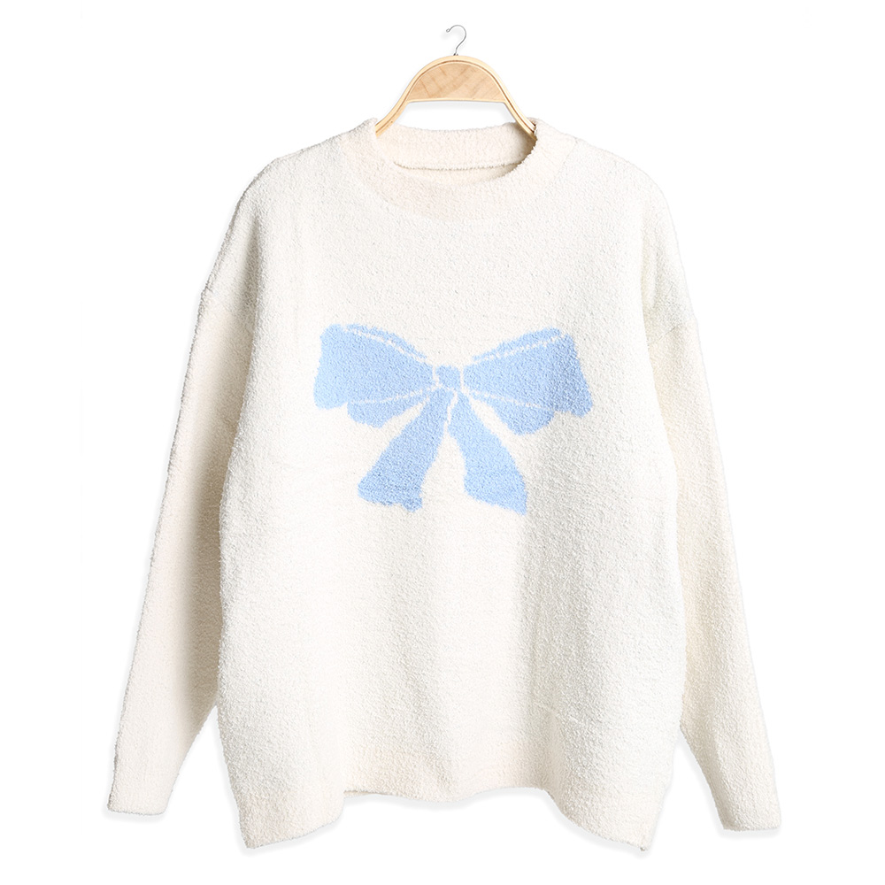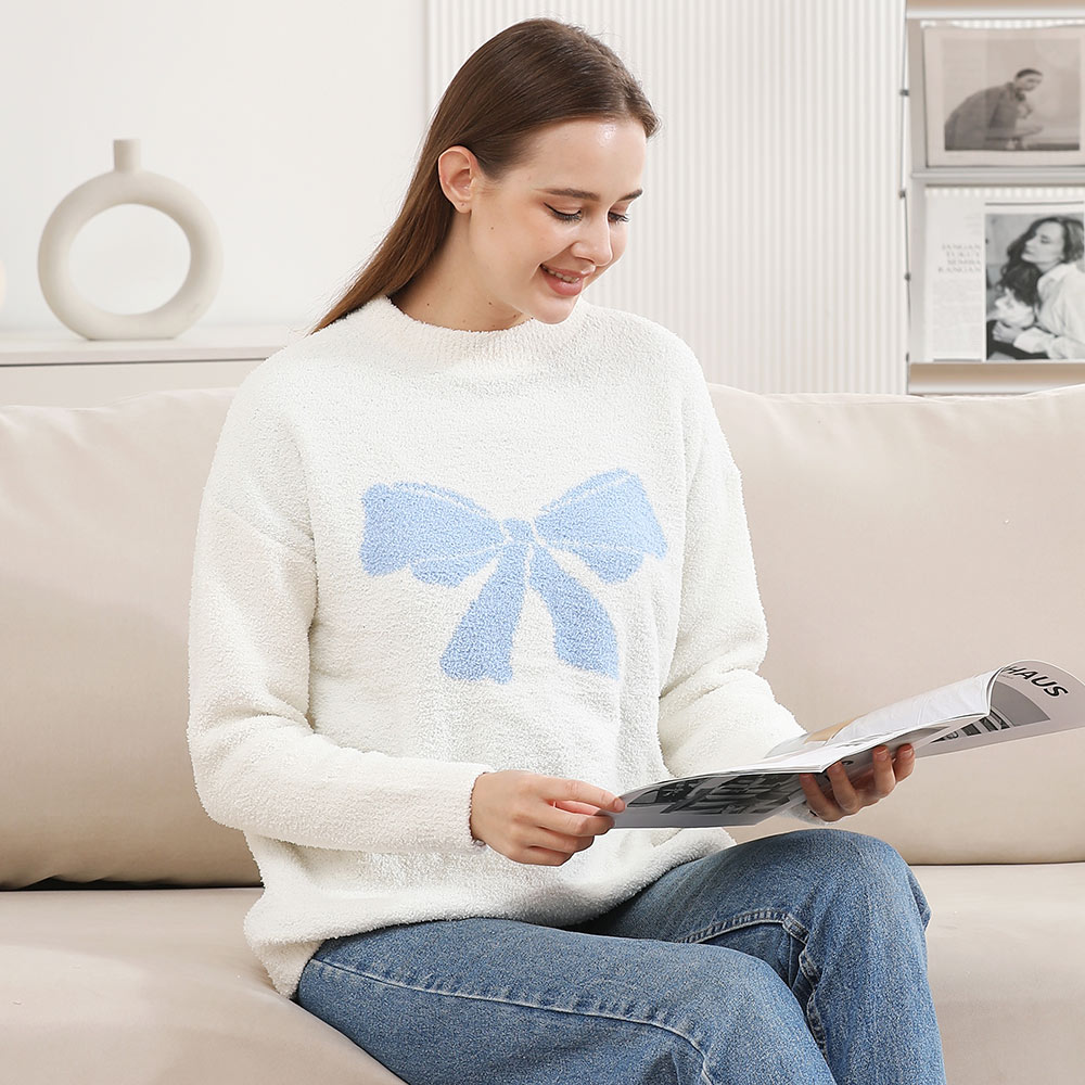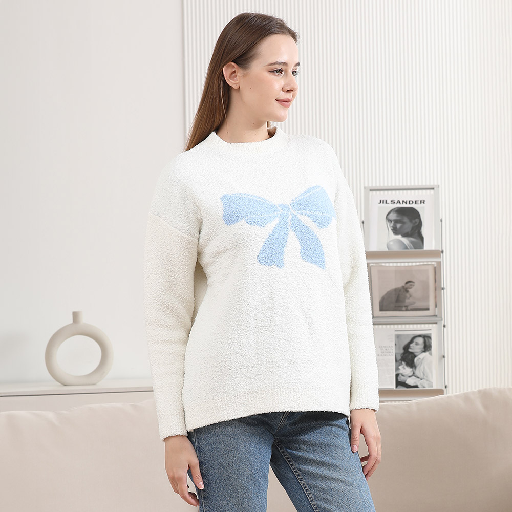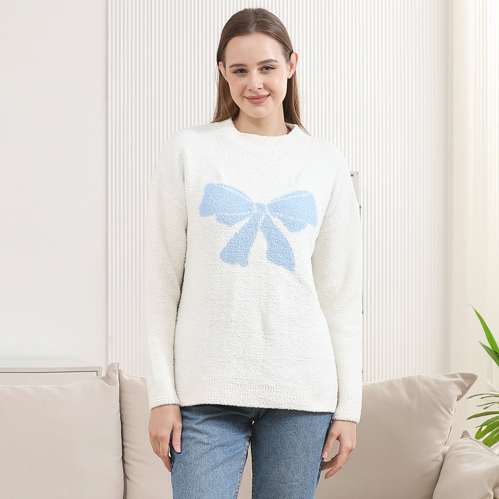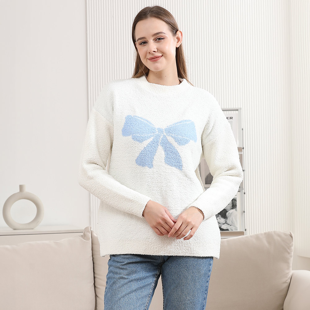 • Stay stylish and warm in this cozy pullover sweater featuring a large front bow design. Ideal for lounging or casual wear, this soft sweater adds a playful and chic element to your everyday look.