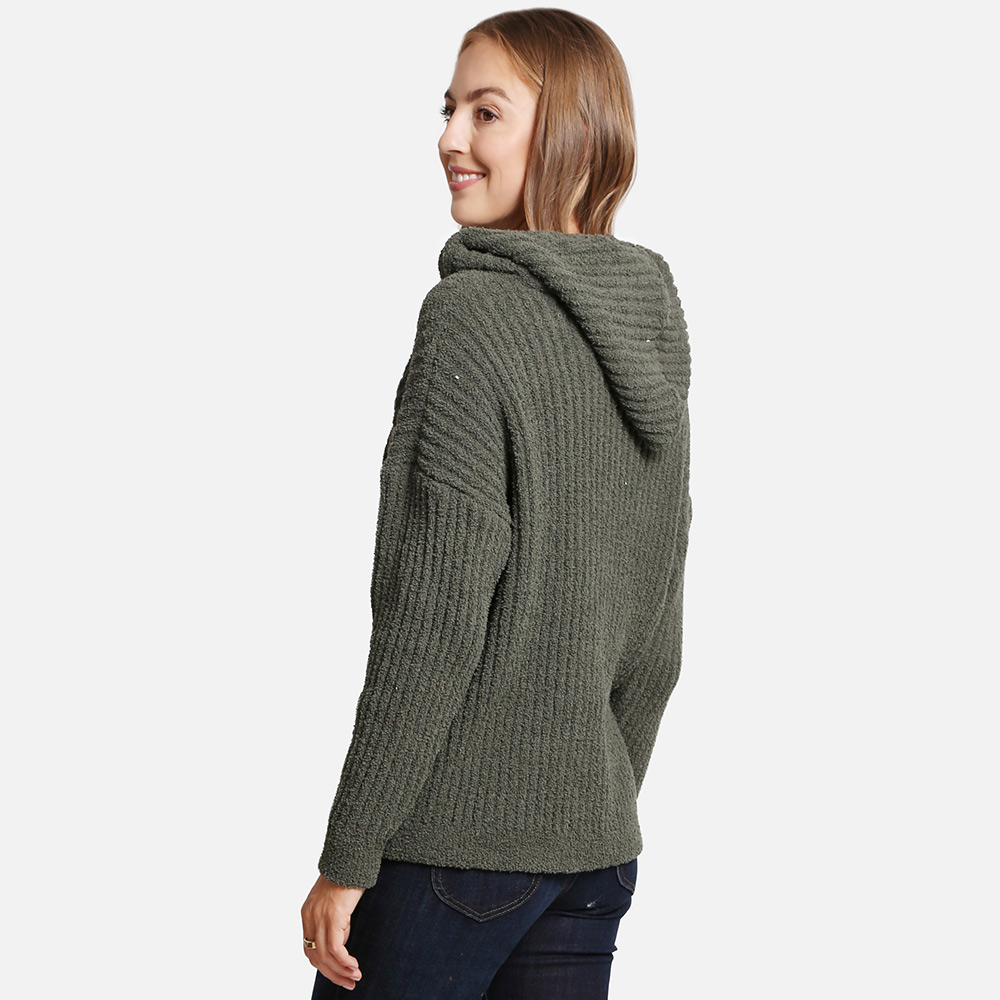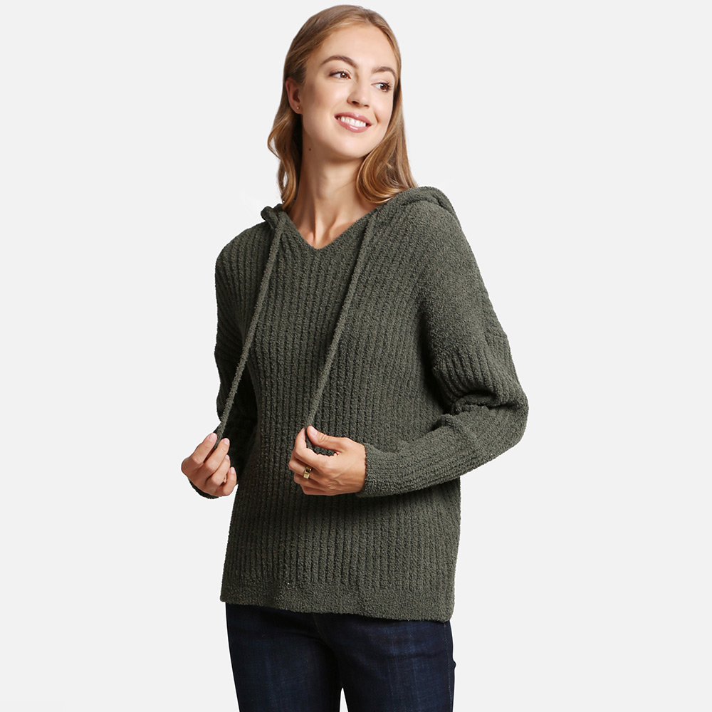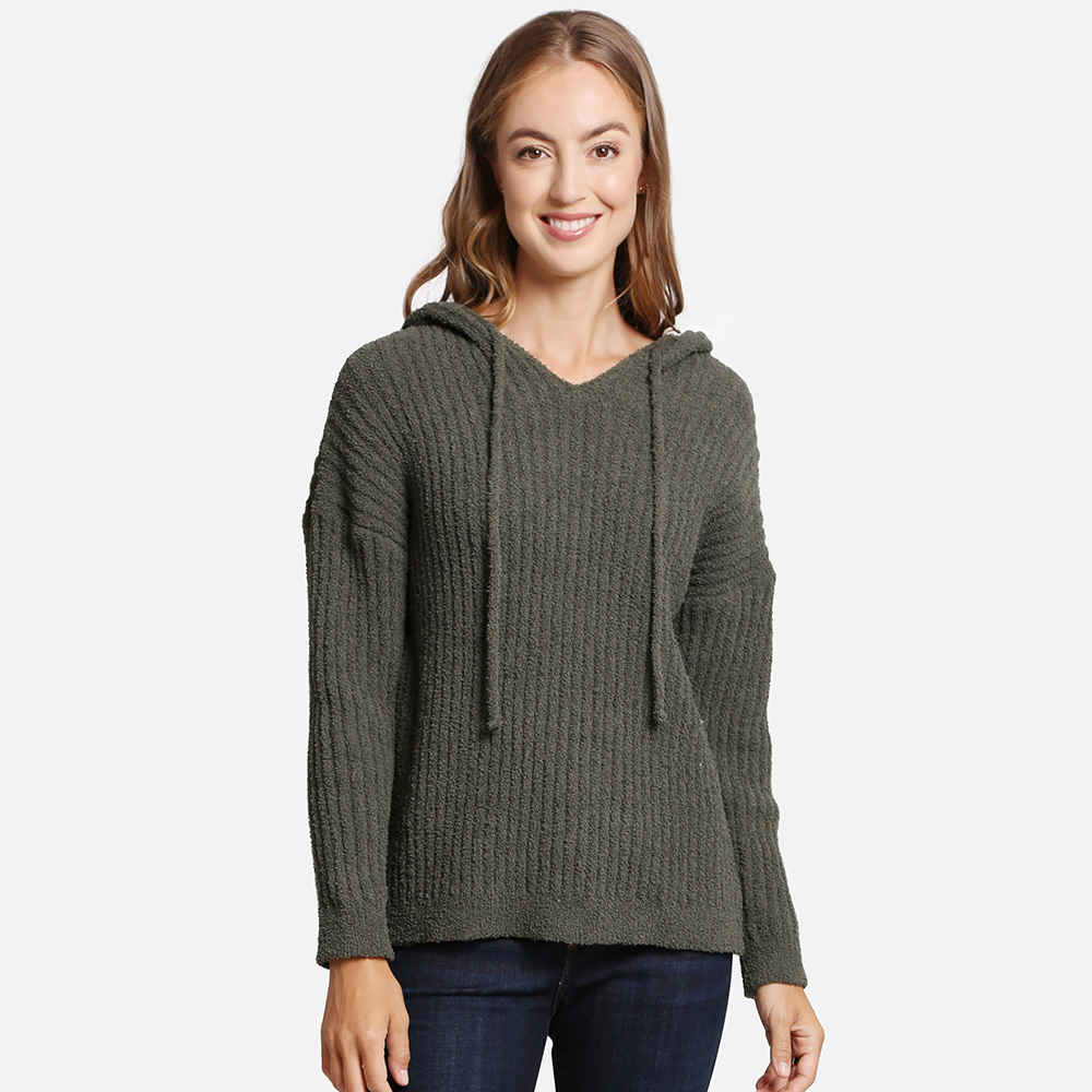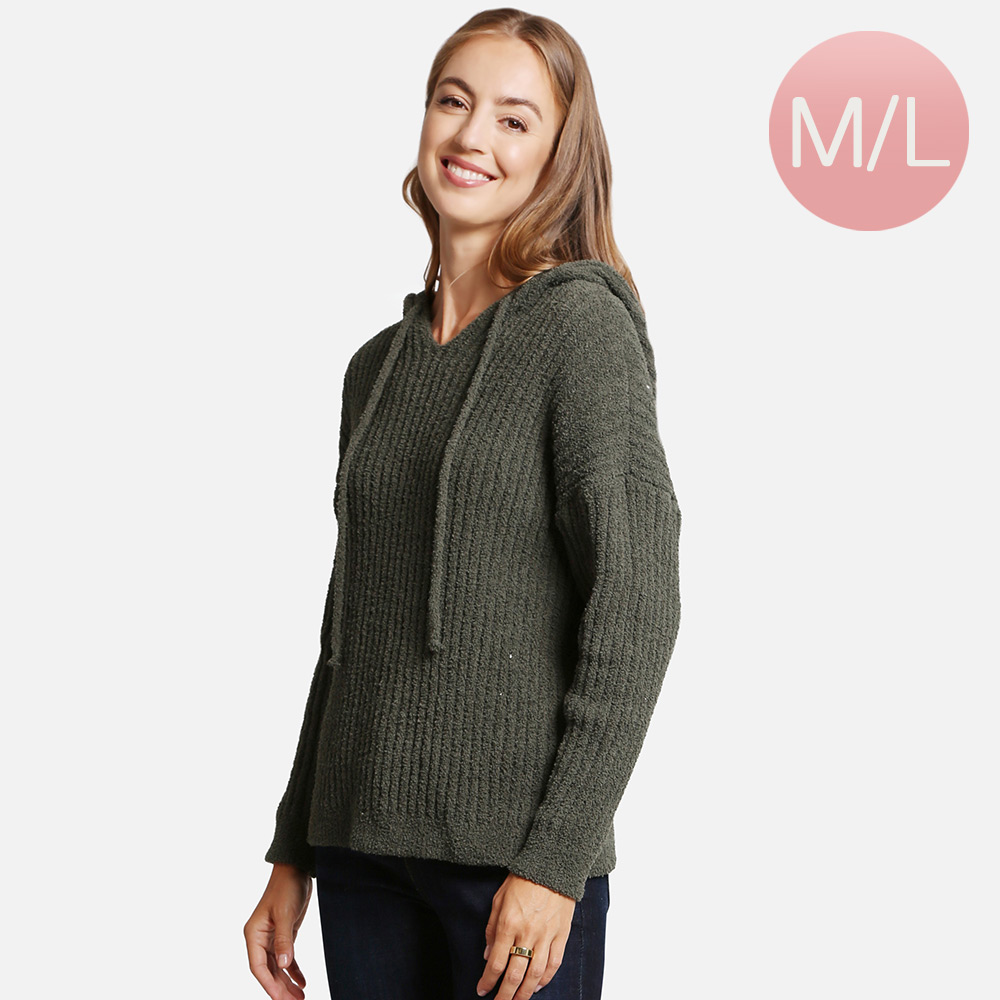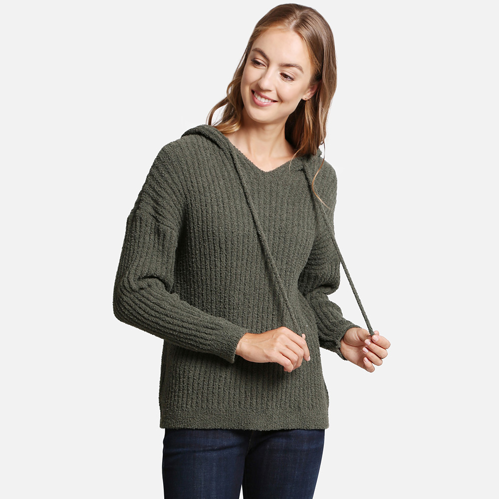 Solid Colored Ribbed Drawstring Hoodie Sweater