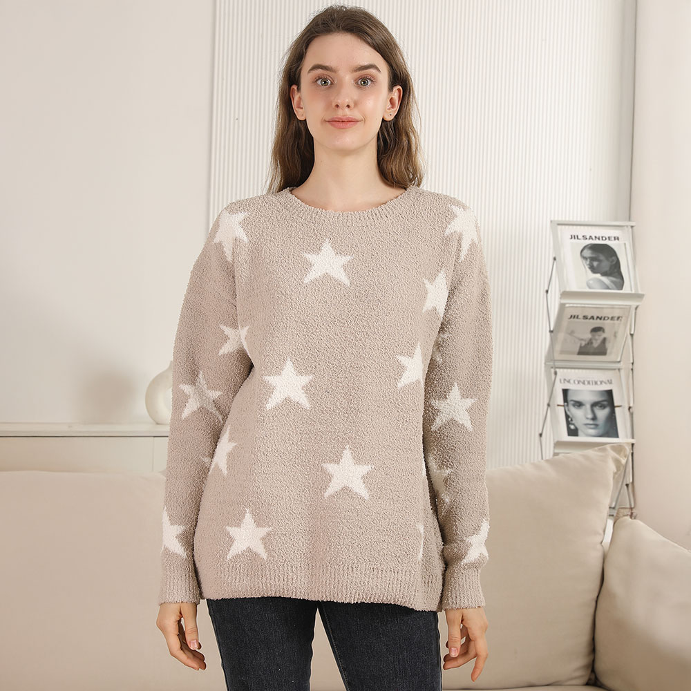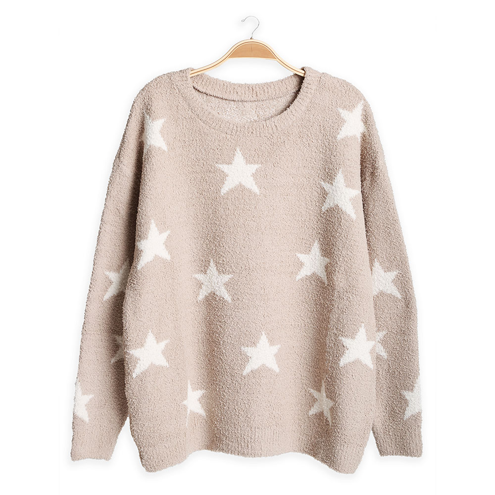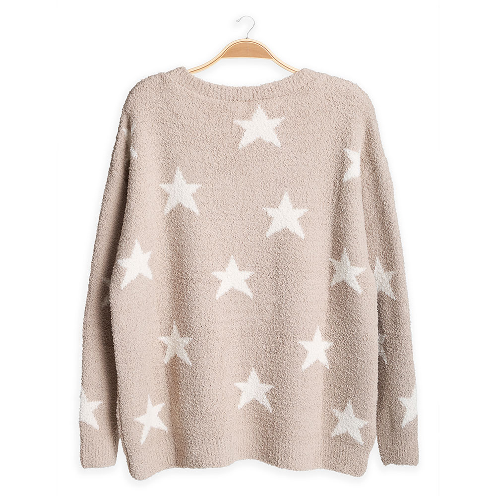 Details • Size : One Size • Material : 100% Poly.Microfiber • Stay cozy and stylish in this soft fuzzy pullover featuring an allover star print. Designed with a relaxed fit and playful charm, it's perfect for lounging or adding fun flair to everyday looks.