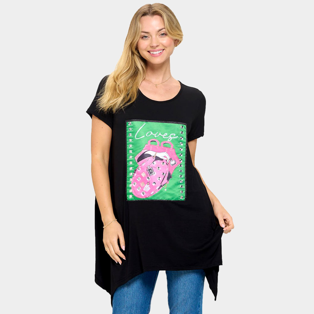 LOVE Flower Bag Printed Crystal Embellished Half Sleeve Top