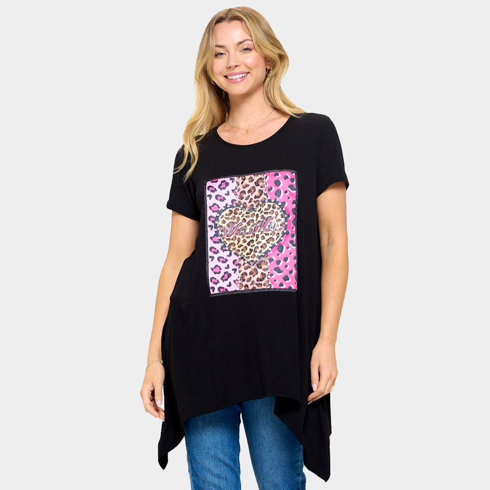 Stone Studded MaMa Message Leopard Heart Printed Half Sleeve Top