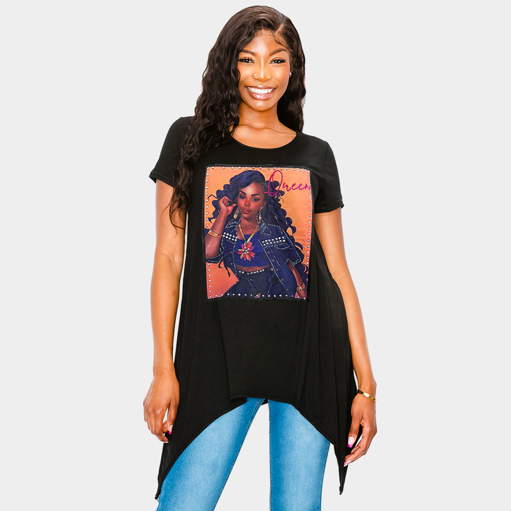 Stone Studded QUEEN Message Glam Woman Printed Half Sleeve Top
