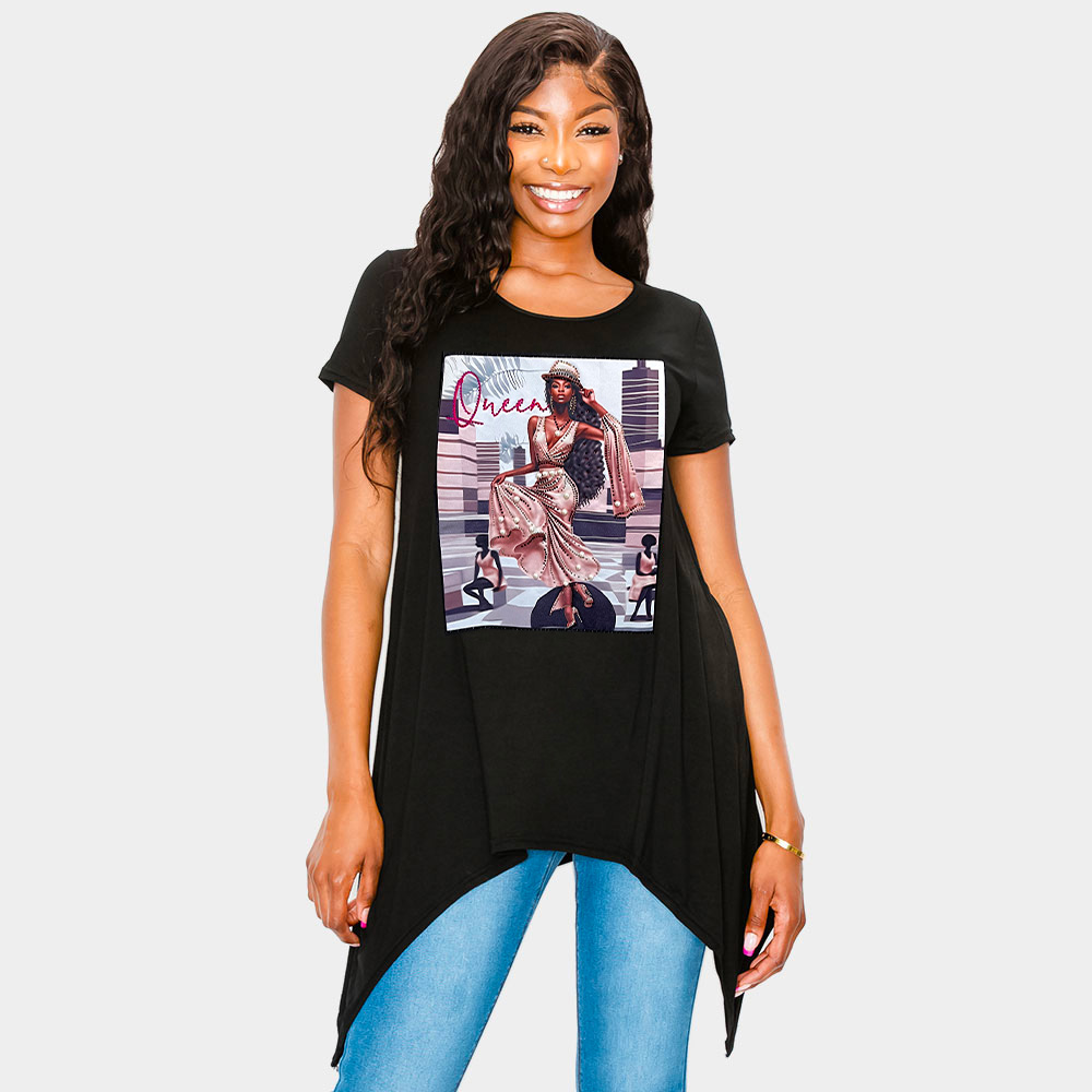 Stone Studded QUEEN Message Glam Woman Printed Half Sleeve Top