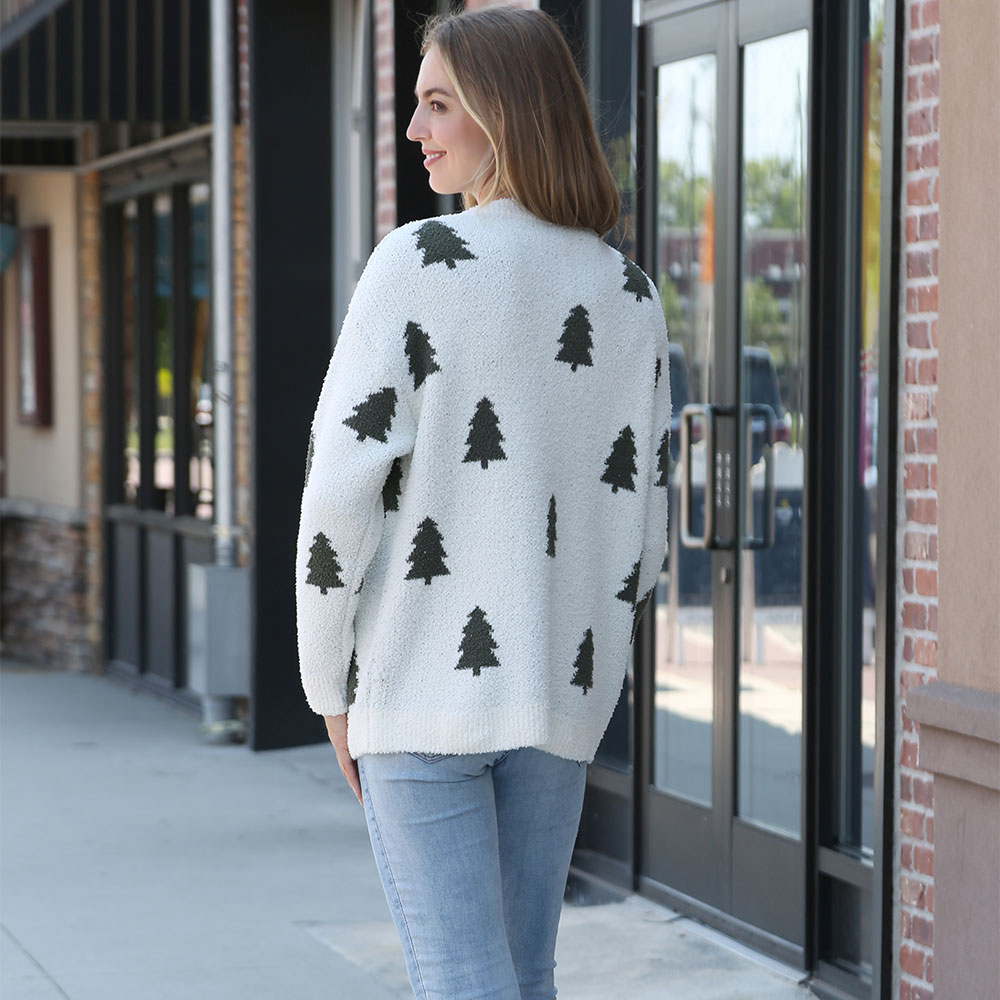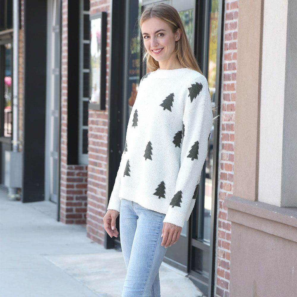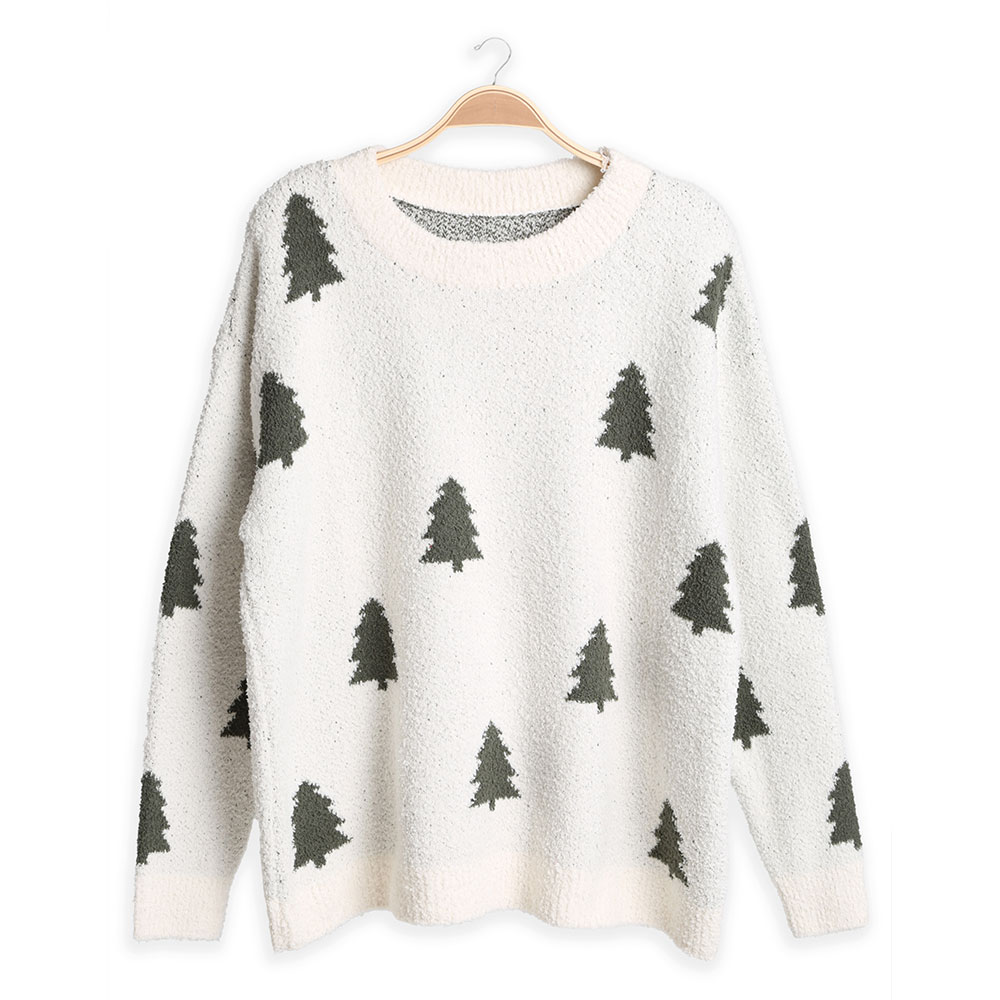 • Fuzzy pullover sweater featuring an allover tree pattern and relaxed silhouette. Perfect for seasonal charm and cozy everyday layering in casual winter looks.