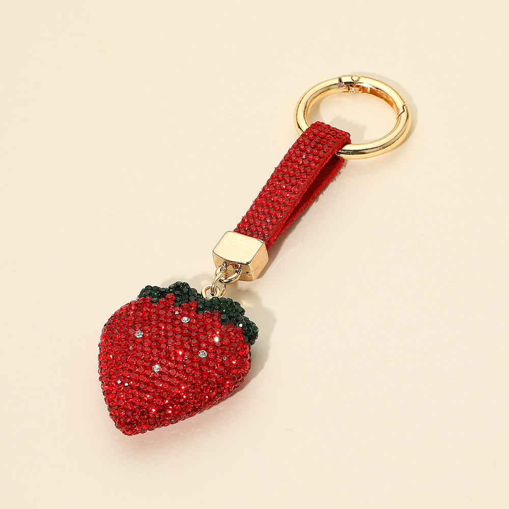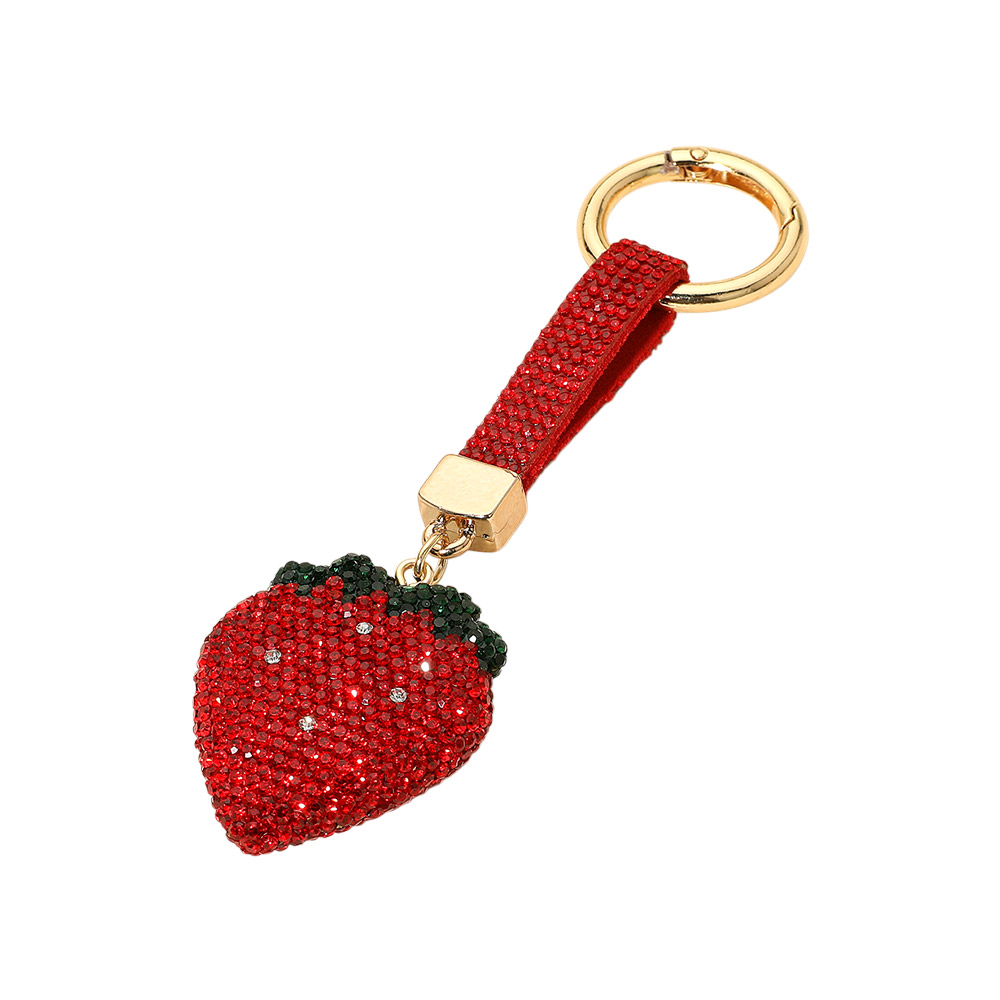 Details • Size : 5.6" L, 1.5" X 2" • Charming rhinestone strawberry keychain featuring a glittery wrist strap and gold-tone ring. Perfect for bags, keys, or gifting. Adds playful sparkle and fun personality to your everyday essentials. • Lead and Nickel Compliant