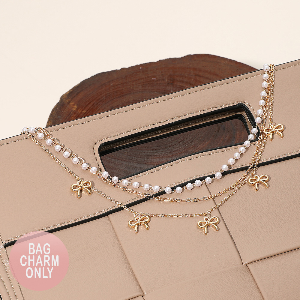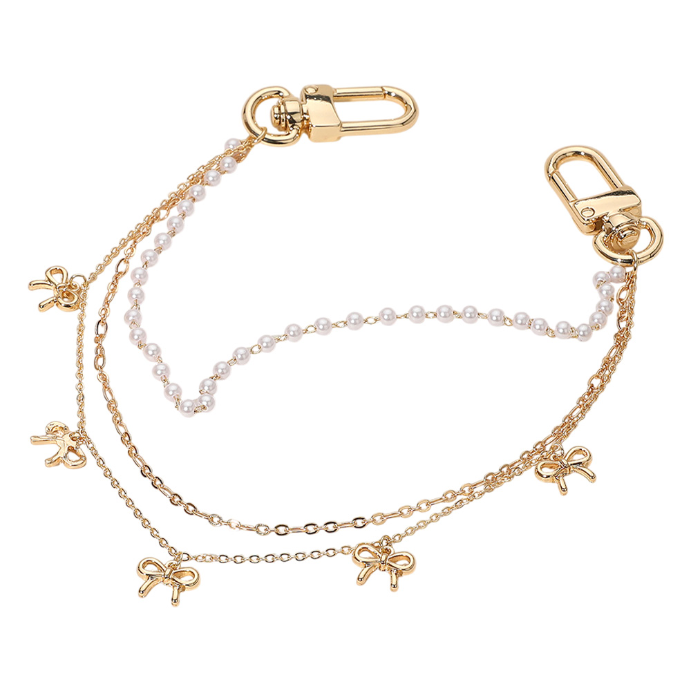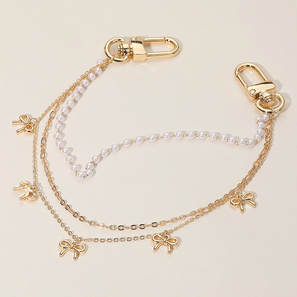 Details • Size : 12" L, 1.5" H • Elegant layered bag charm combining delicate pearl-like beads and fine gold-tone chains adorned with small bow pendants. Designed to drape beautifully over handbag handles, it adds a feminine and refined touch to totes, clutches, and other accessories. • Lead and Nickel Compliant