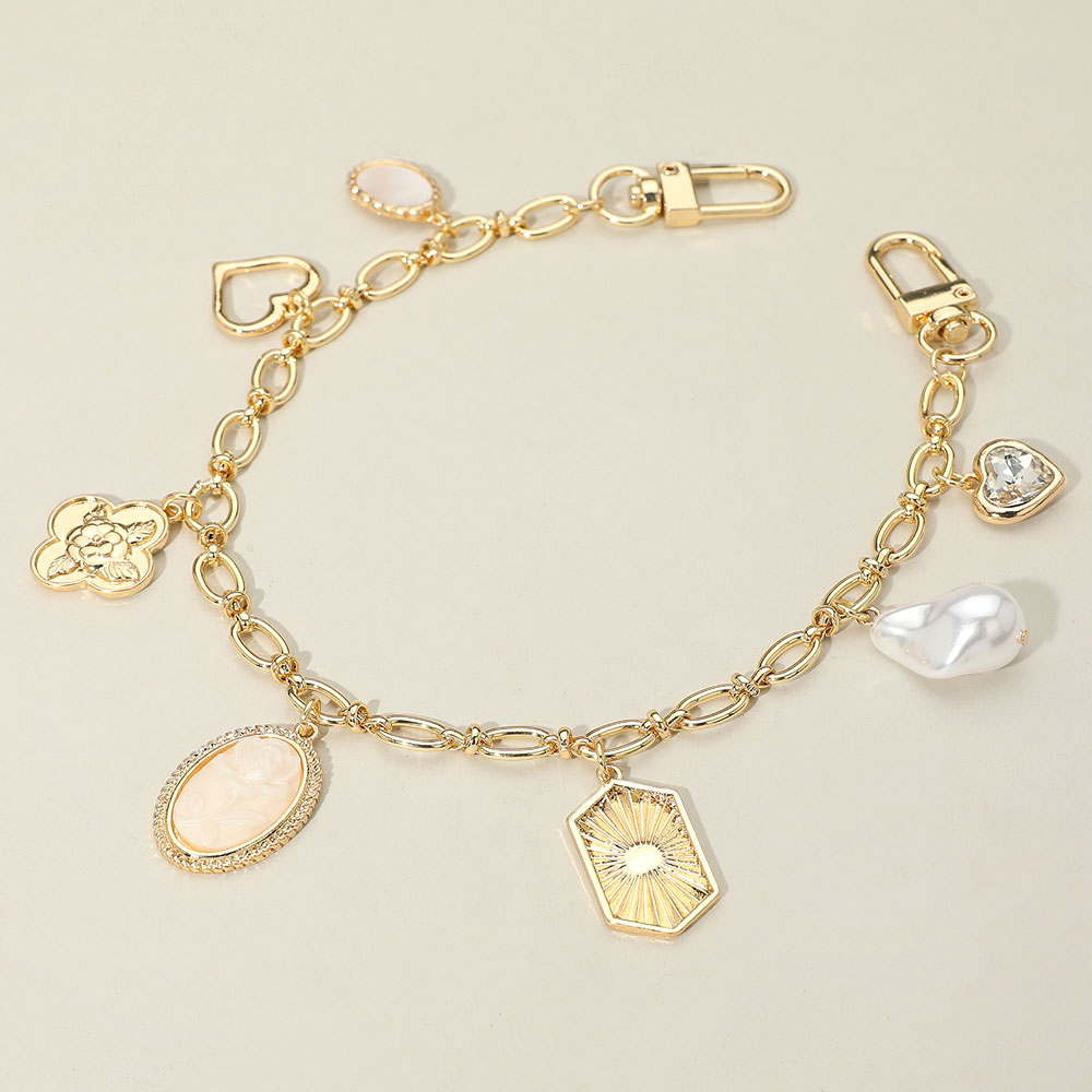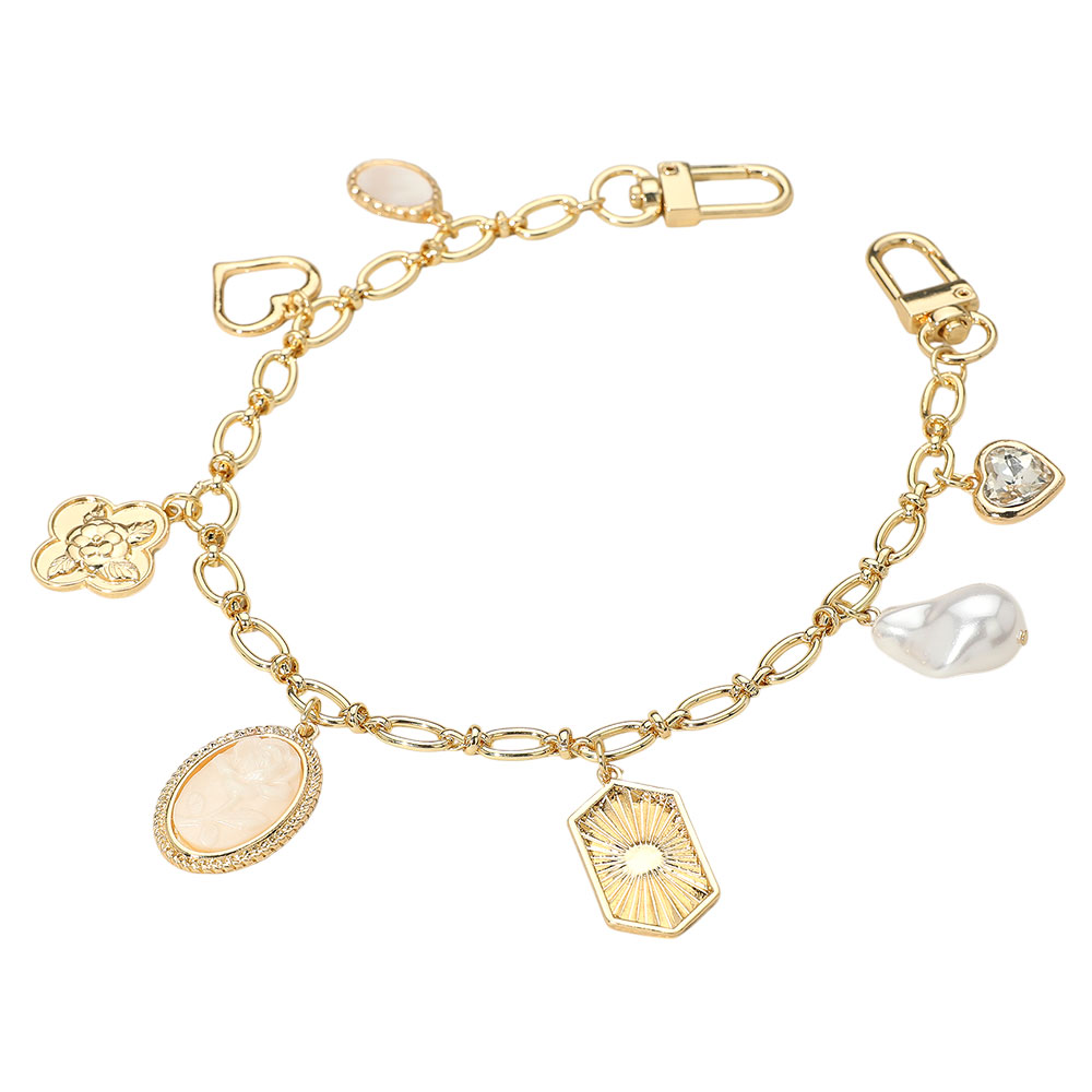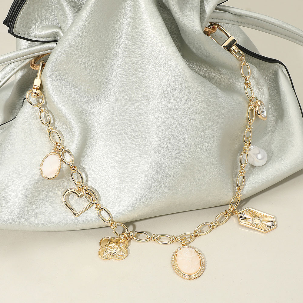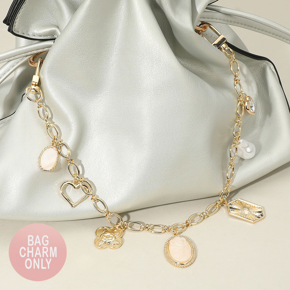 Details • Size : 13.5" L • Charm Size : 1.3" L • Elevate your bag’s look with this stylish chain strap adorned with assorted decorative pendants. Features easy-to-use clasp hooks and adds a touch of personality to any handbag. • Lead and Nickel Compliant