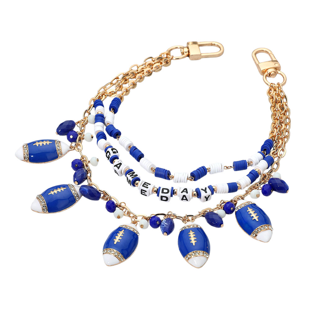 • Layered bag charm featuring bold football charms, beaded details, and playful "GAMEDAY" lettering. Designed to show team spirit in style, this sporty statement piece is perfect for football fans and gameday outfits.