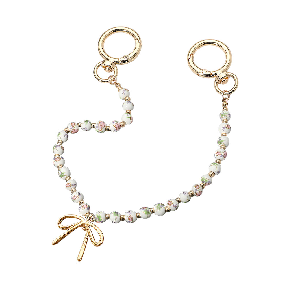 Details • Size : 11.5" L • Charm Size : 1" X 0.75" • Add a charming accent to your handbag with this delicate bow bag charm featuring decorative beading. Perfect for enhancing your daily accessories with a playful, stylish twist. • Lead and Nickel Compliant