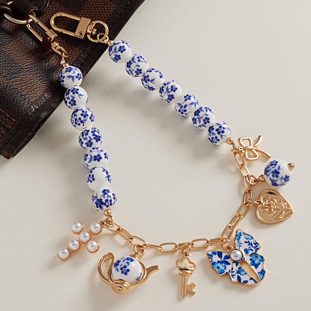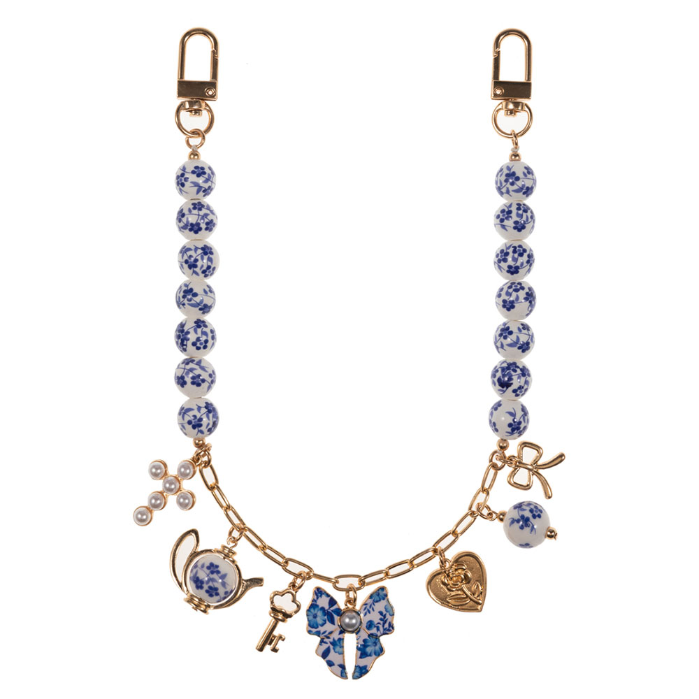 Details • Size : 15" L • Decor Size : 1.1" L • Charming gold-tone accessory featuring hand-painted blue floral beads and whimsical charms including a butterfly, teapot, key, and heart. Perfect as a stylish bag chain, mask holder, or decorative strap. Adds a playful, vintage-inspired flair to any ensemble. • Lead and Nickel Compliant
