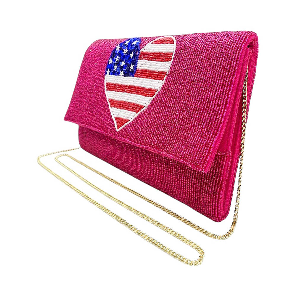 American USA Flag Heart Seed Beaded Clutch / Crossbody Bag