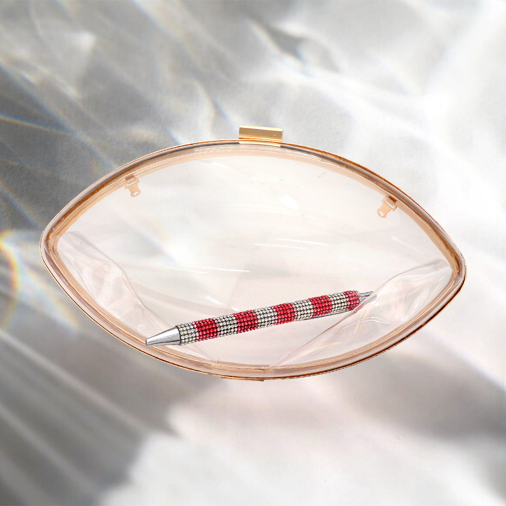 • Stylish clear oval clutch featuring a compact design and includes a glitter-accented pen. Perfect for events, parties, or gifting, this modern accessory combines function and flair in one sleek piece.