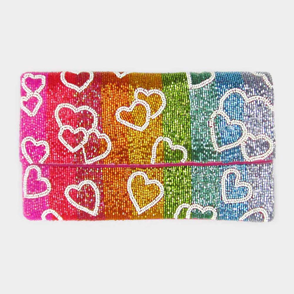 Heart Accented Rainbow Striped Beaded Clutch / Crossbody Bag