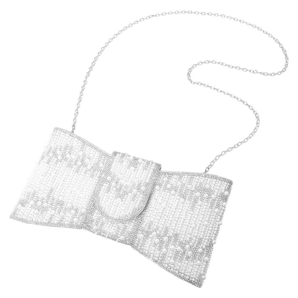 Details • Size : 10.5" X 5.74" • Strap Size : 45" L / Detachable • Magnetic Closure • Zipper Closure • Complete your evening look with this exquisite bow clutch bag, adorned with radiant rhinestones and a delicate chain strap. Perfect for weddings, galas, or formal outings, this stylish accessory offers elegance and charm in a unique silhouette that stands out.