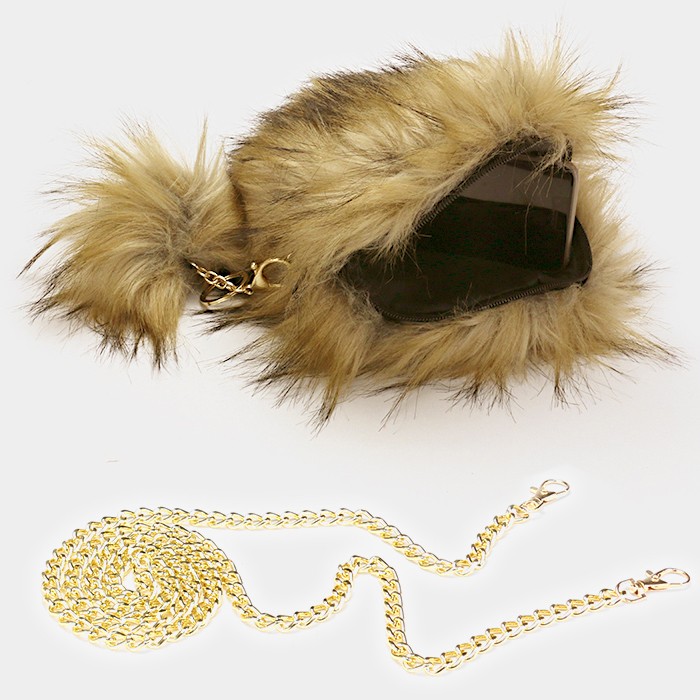 Rounded faux fur zip crossbody bag with detachable pom pom charm