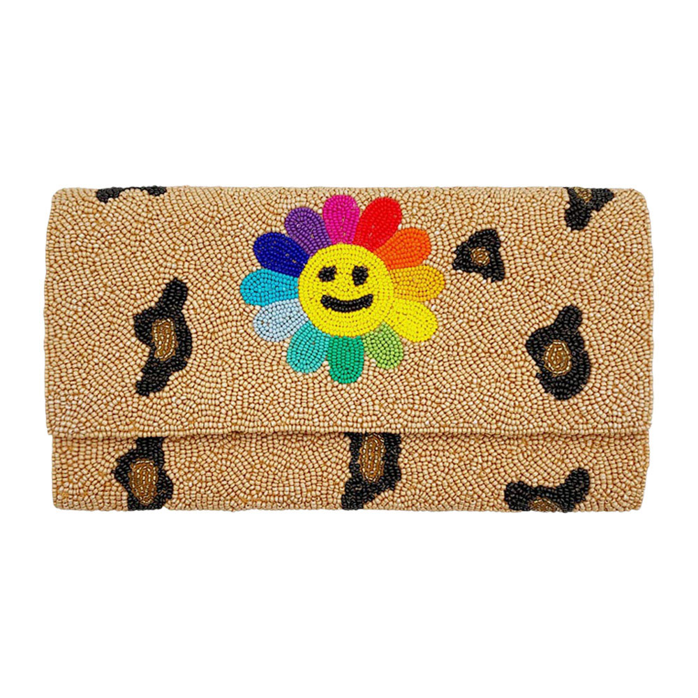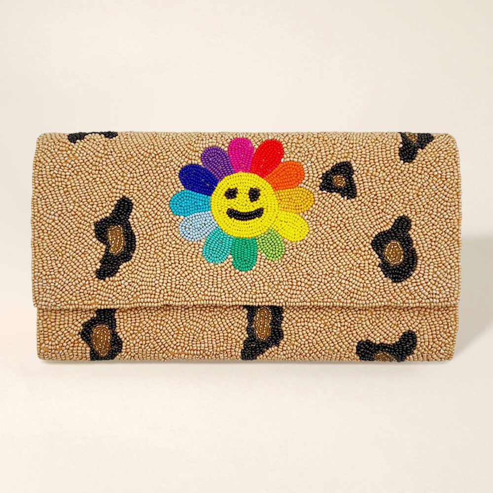 Smile Flower Accented Leopard Patterned Seed Beaded Clutch / Crossbody Bag