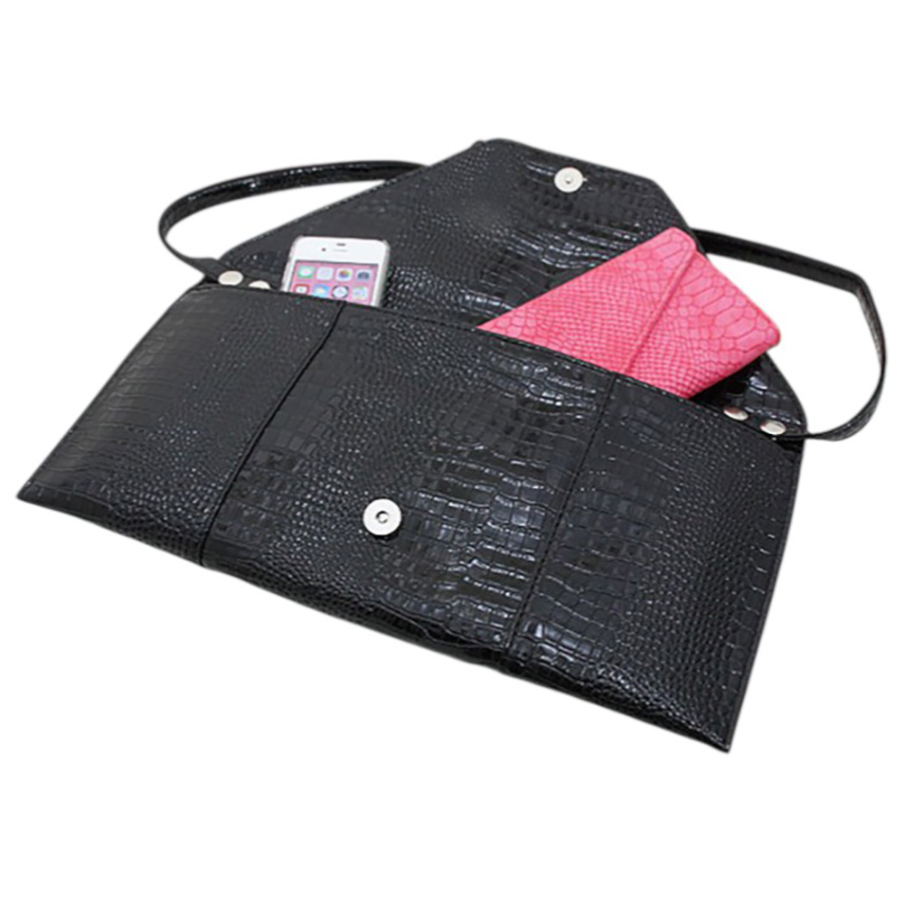 Details • Bag Size : 15" X 7.5" • Strap Size : 21.5" L / Detachable • One Inside Slip Pocket • Zipper and Magnetic Closure • A stylish envelope clutch featuring a textured design with a sleek, modern finish. Perfect for carrying essentials, this versatile accessory transitions effortlessly from day to night, adding a refined touch to any outfit.