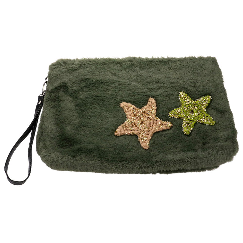 Star Patches Fuzzy Faux Fur Wristlet Clutch Bag
