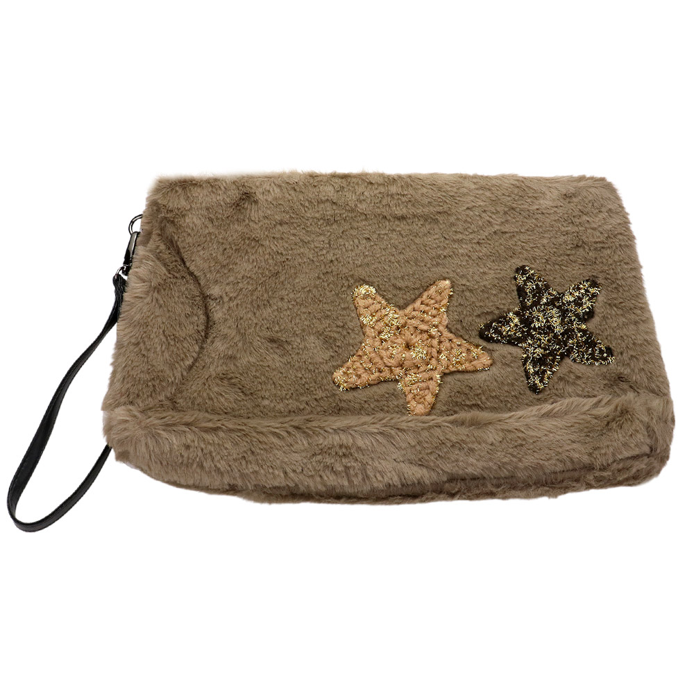Star Patches Fuzzy Faux Fur Wristlet Clutch Bag