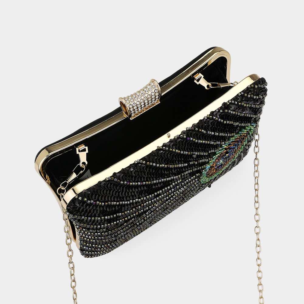 Details • Size : 7.25" X 5.25" X 2" • Strap Size : 46" L / Detachable • Clasp Closure • Add a bold statement to your look with this sequin peacock feather clutch. Featuring intricate beadwork, a sparkling clasp, and detachable chain strap, this glamorous evening purse is perfect for parties, weddings, and special events.