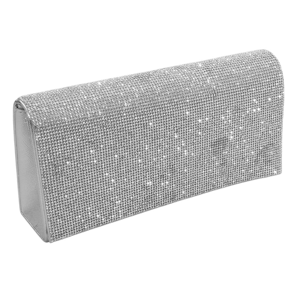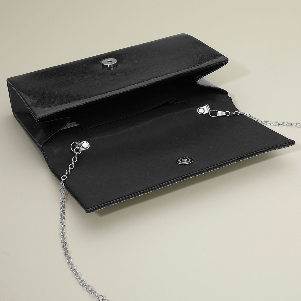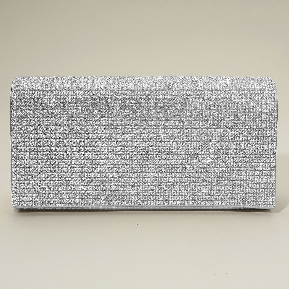 Details • Size : 9.25" X 4.5" X 1.75" • Strap Size : 46" L / Detachable • One Inside Slip Pocket • Magnetic Closure • Elegant evening clutch adorned with shimmering crystals and a detachable chain strap. Sleek rectangular silhouette makes it perfect for formal events, weddings, or night-outs.
