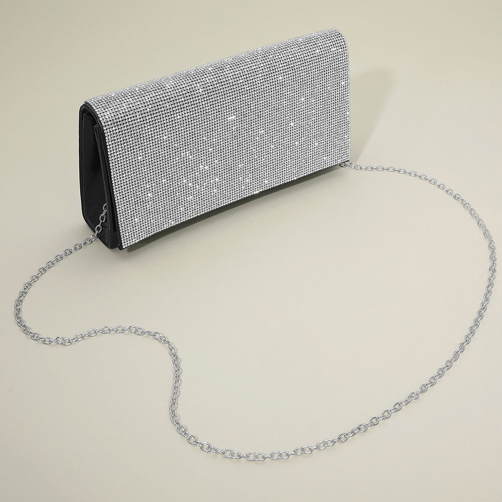 • Elegant evening clutch adorned with shimmering crystals and a detachable chain strap. Sleek rectangular silhouette makes it perfect for formal events, weddings, or night-outs.