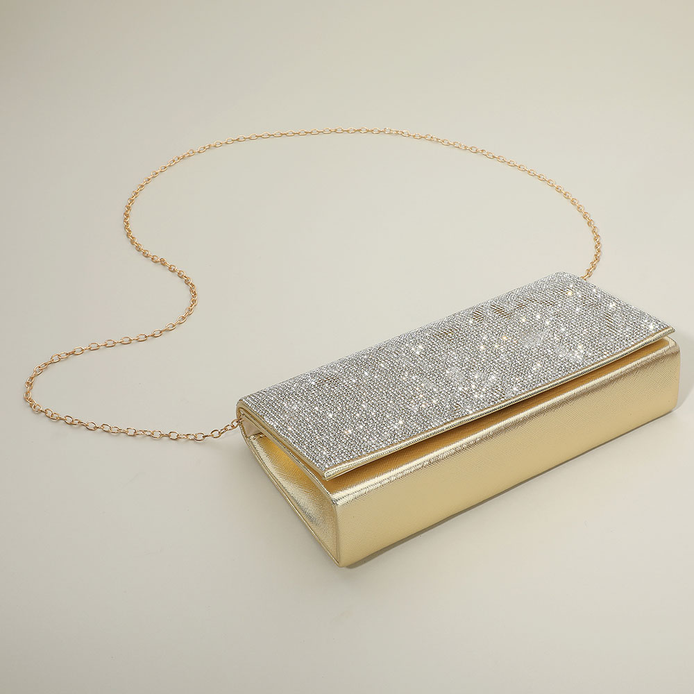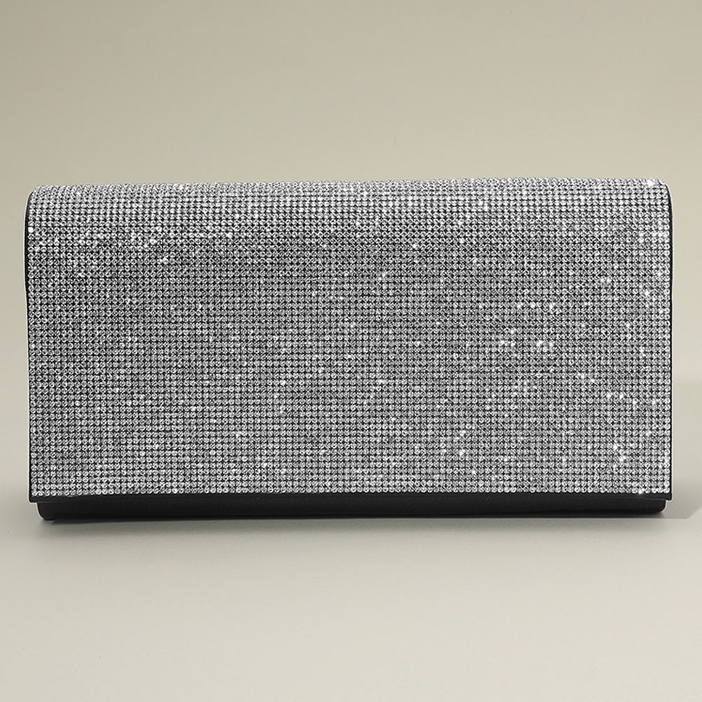 Details • Size : 9.25" X 4.5" X 1.75" • Strap Size : 46" L / Detachable • One Inside Slip Pocket • Magnetic Closure • Elegant evening clutch adorned with shimmering crystals and a detachable chain strap. Sleek rectangular silhouette makes it perfect for formal events, weddings, or night-outs.