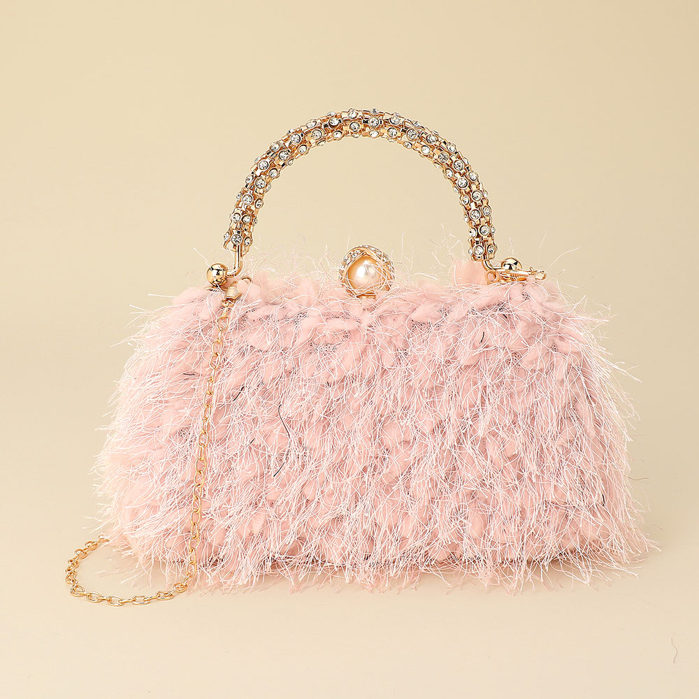 • This elegant evening bag features soft feather accents, a crystal-embellished handle, and a delicate chain strap for versatile carrying. Perfect for formal events or glamorous nights out, it adds a statement touch of luxury and sophistication to any outfit.