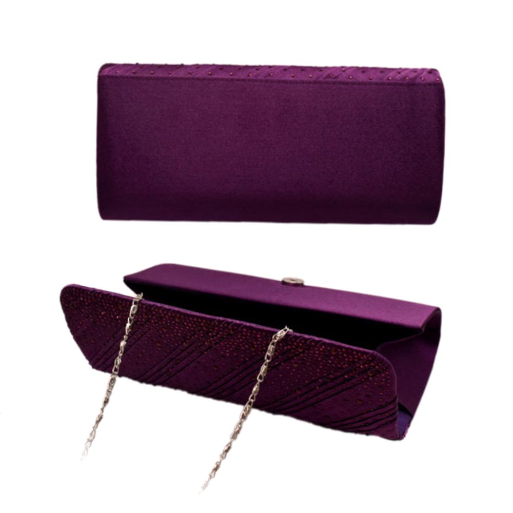 Details • Bag Size : 9" X 2" X 4.25" • Chain Strap Size : 23" L (Detachable) • One Inside Slip Pocket • Magnetic Closure • Shimmer and shine at any event with this elegant metallic evening clutch featuring a refined diagonal textured design. Perfectly sized for your essentials, this sleek and modern accessory adds a touch of sophistication to formal looks, weddings, and special occasions.