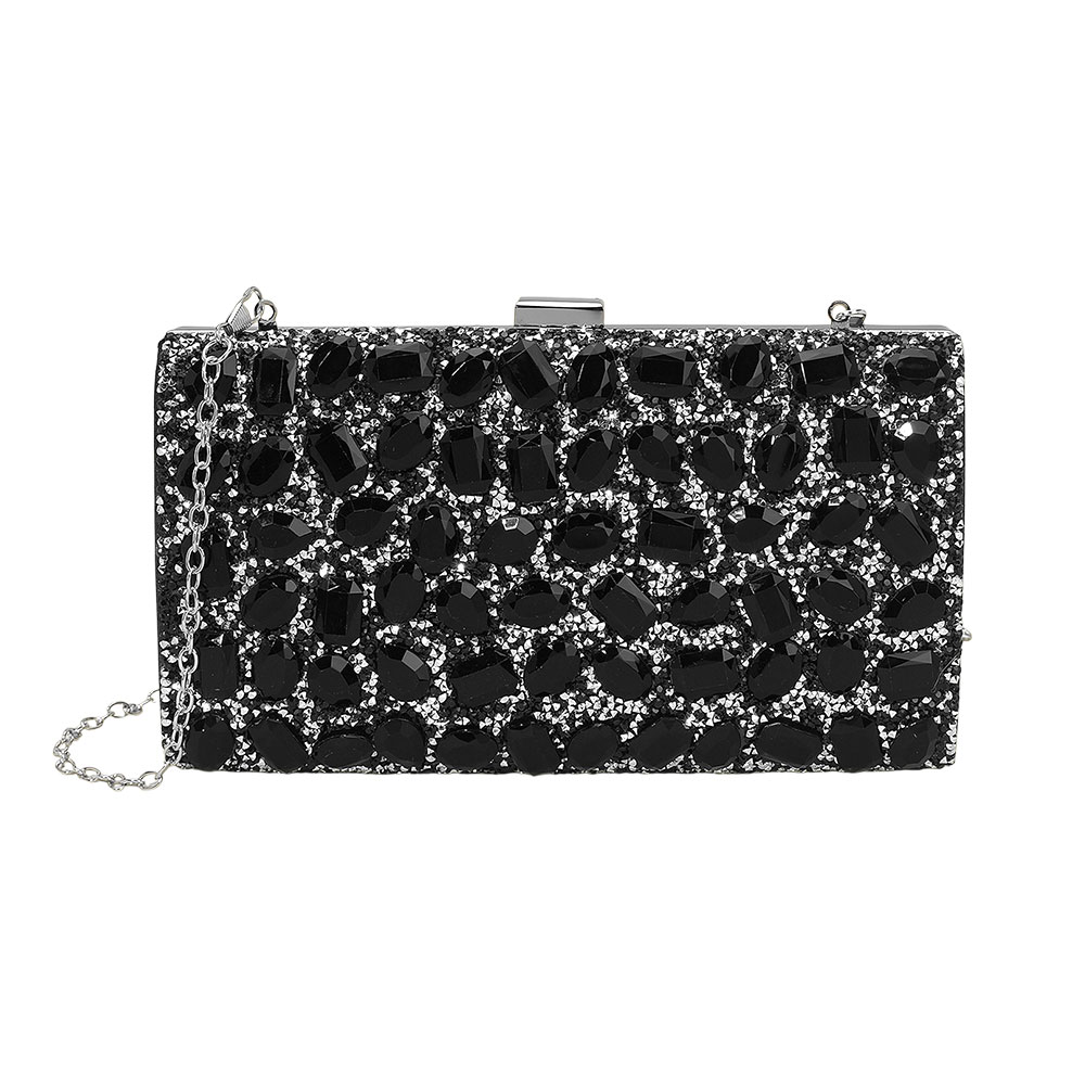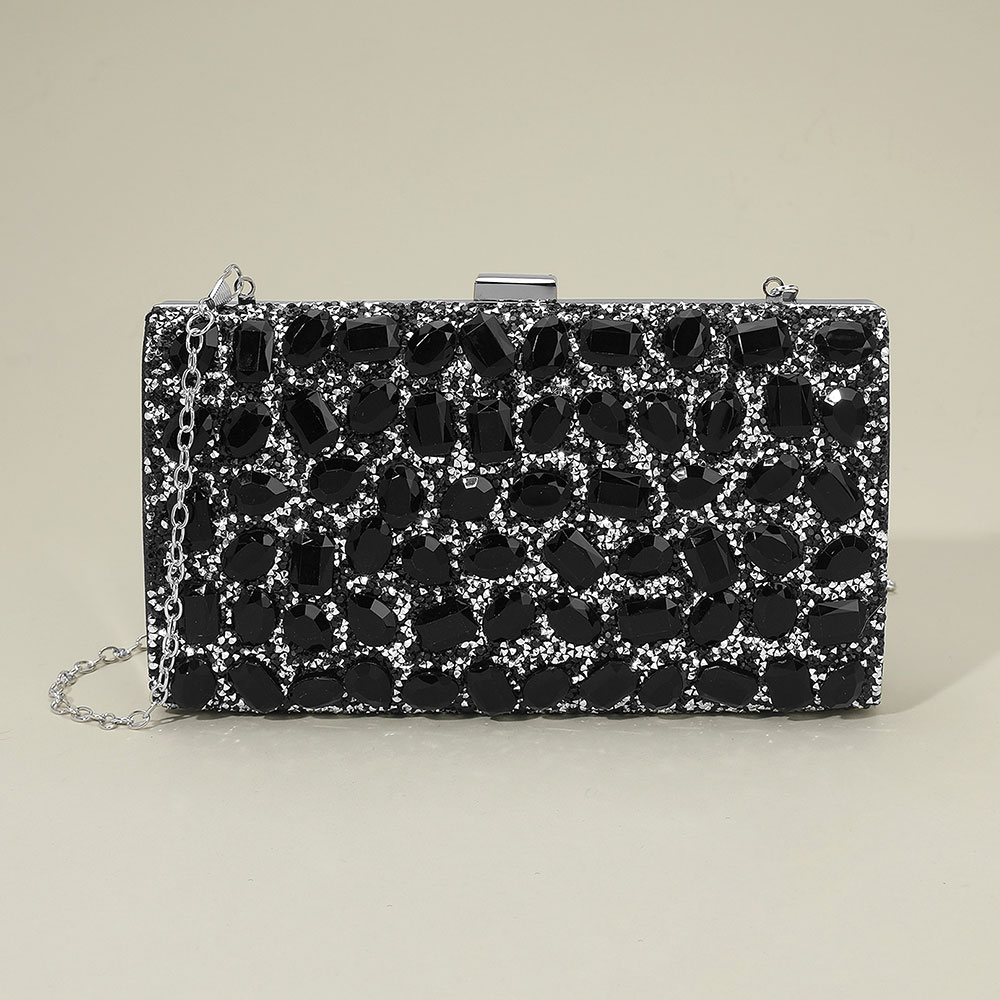 • Glamorous evening clutch adorned with sparkling stone accents for a statement look. Designed with a sleek silhouette and chain strap, this stylish accessory adds a touch of elegance to special occasions, parties, and night-out outfits.