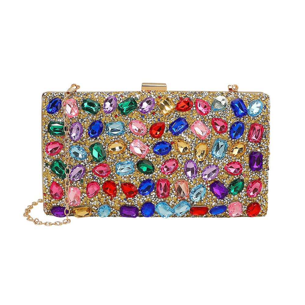 Details • Size : 8.6" X 4.6" X 1.6" • Strap Size : 47" L / Detachable • Clasp Closure • Glamorous evening clutch adorned with sparkling stone accents for a statement look. Designed with a sleek silhouette and chain strap, this stylish accessory adds a touch of elegance to special occasions, parties, and night-out outfits.