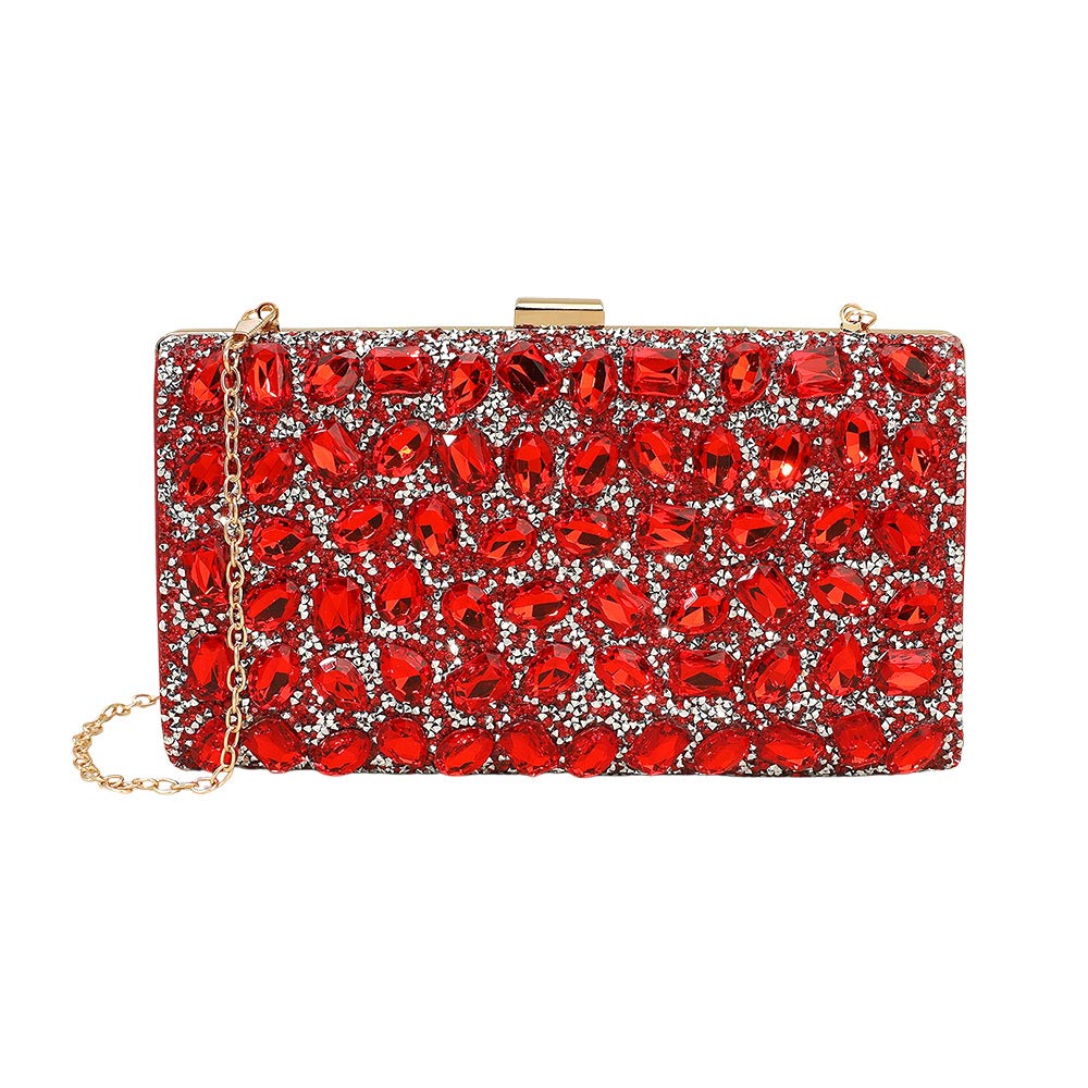 • Glamorous evening clutch adorned with sparkling stone accents for a statement look. Designed with a sleek silhouette and chain strap, this stylish accessory adds a touch of elegance to special occasions, parties, and night-out outfits.