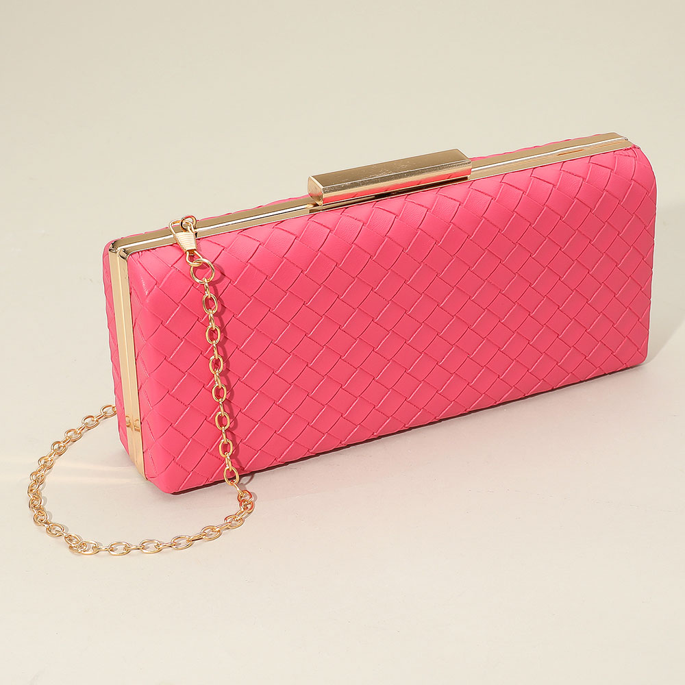 • Chic woven clutch bag featuring a sleek gold-tone frame and detachable chain strap. Perfect for weddings, evening events, or formal occasions. Structured design adds elegance and sophistication.