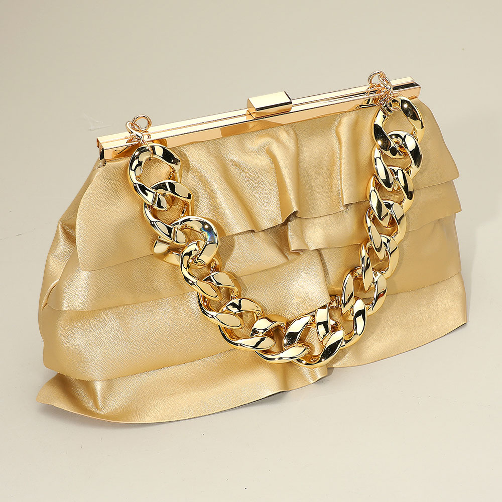 Details • Size : 12.5" X 7.5" X 3.5" • Top Handle Size : 6.5" L • Strap Size : 46" L / Detachable • Clasp Closure • Statement clutch bag with soft layered ruffle texture and chunky gold chain handle. Features a sleek frame closure and structured silhouette—perfect for evening events, weddings, and special occasions.