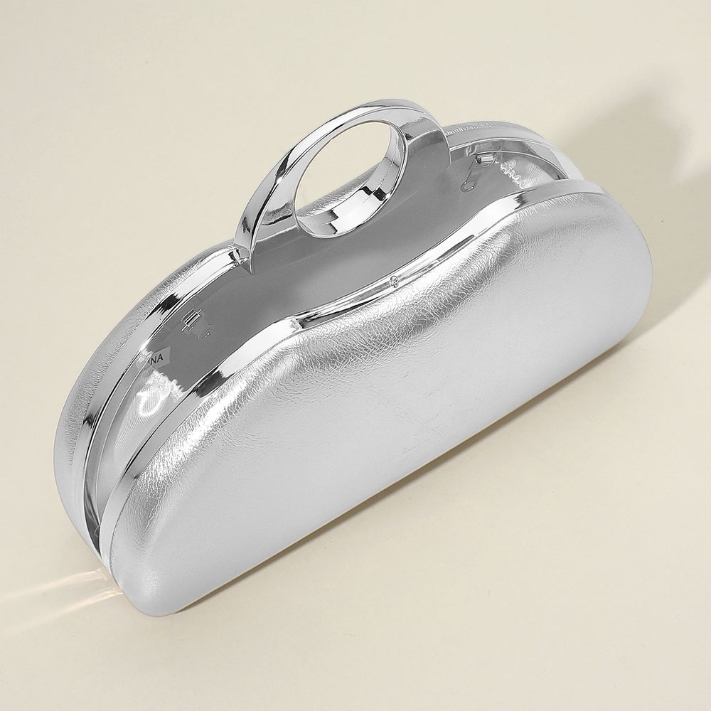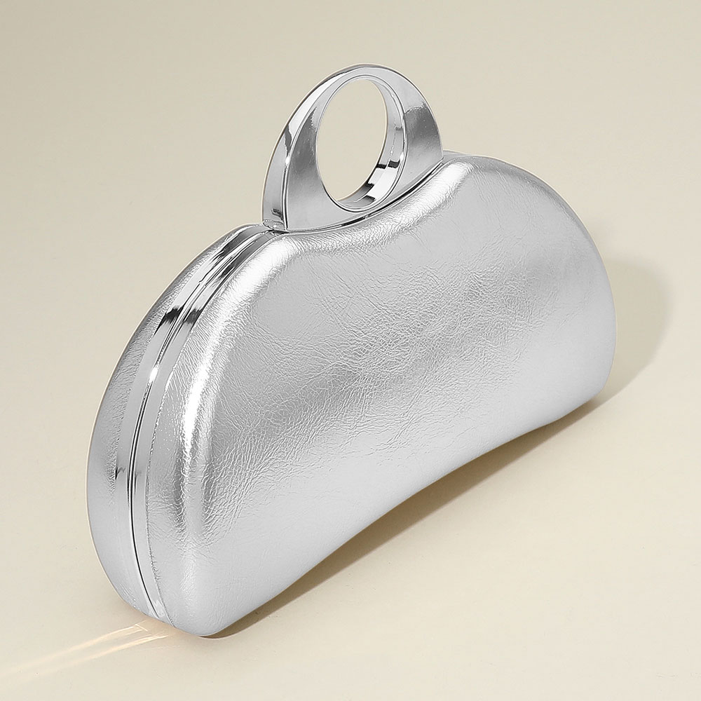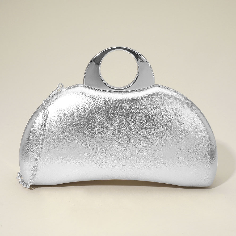 • Chic half-moon clutch bag featuring a sleek metallic finish, circular top handle, and detachable chain strap. A standout accessory for formal events, parties, or evening wear.