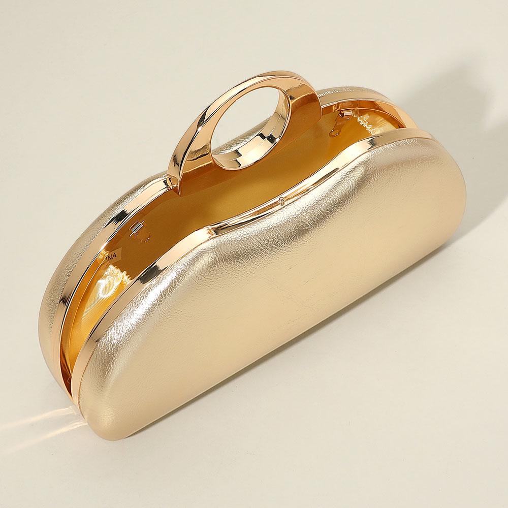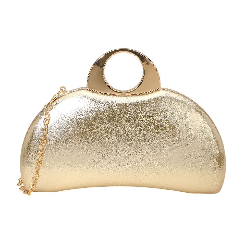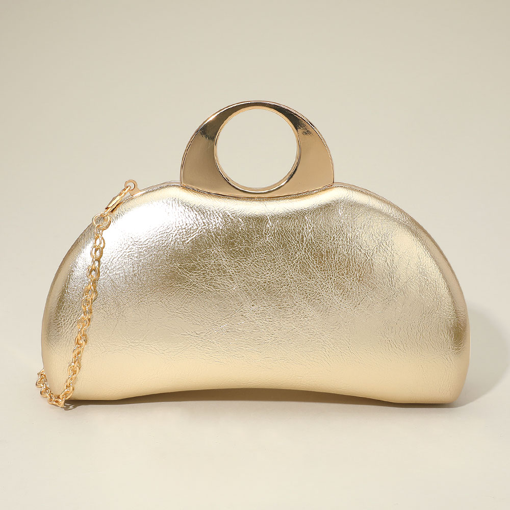 Details • Size : 8.25" X 5.5" X 2.25" • Top Handle Size : 1.7" L • Strap Size : 46" L / Detachable • Clasp Closure • Chic half-moon clutch bag featuring a sleek metallic finish, circular top handle, and detachable chain strap. A standout accessory for formal events, parties, or evening wear.