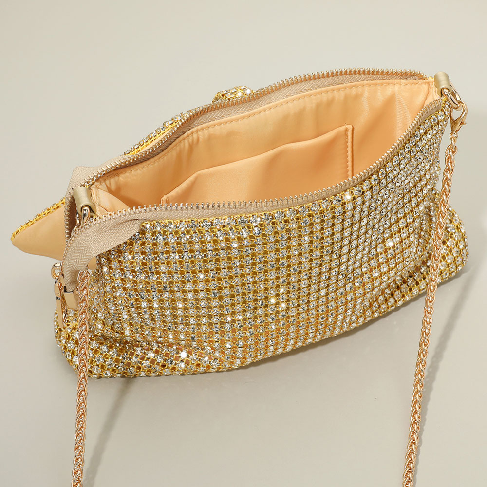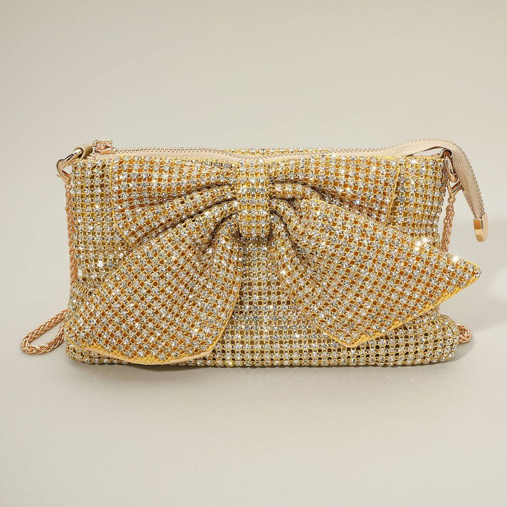 Details • Size : 9.25" X 5.25" X 2.75" • Strap Size : 42" L / Detachable • One Inside Slip Pocket • Zipper Closure • Sparkling mesh clutch with dazzling rhinestones and a statement bow detail. Features zipper closure, chain strap, and structured design ideal for parties, events, or glamorous nights out.