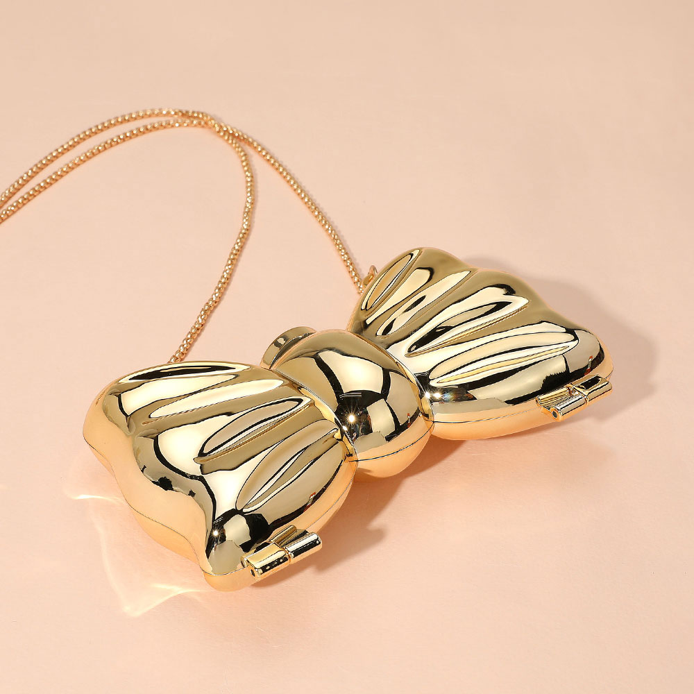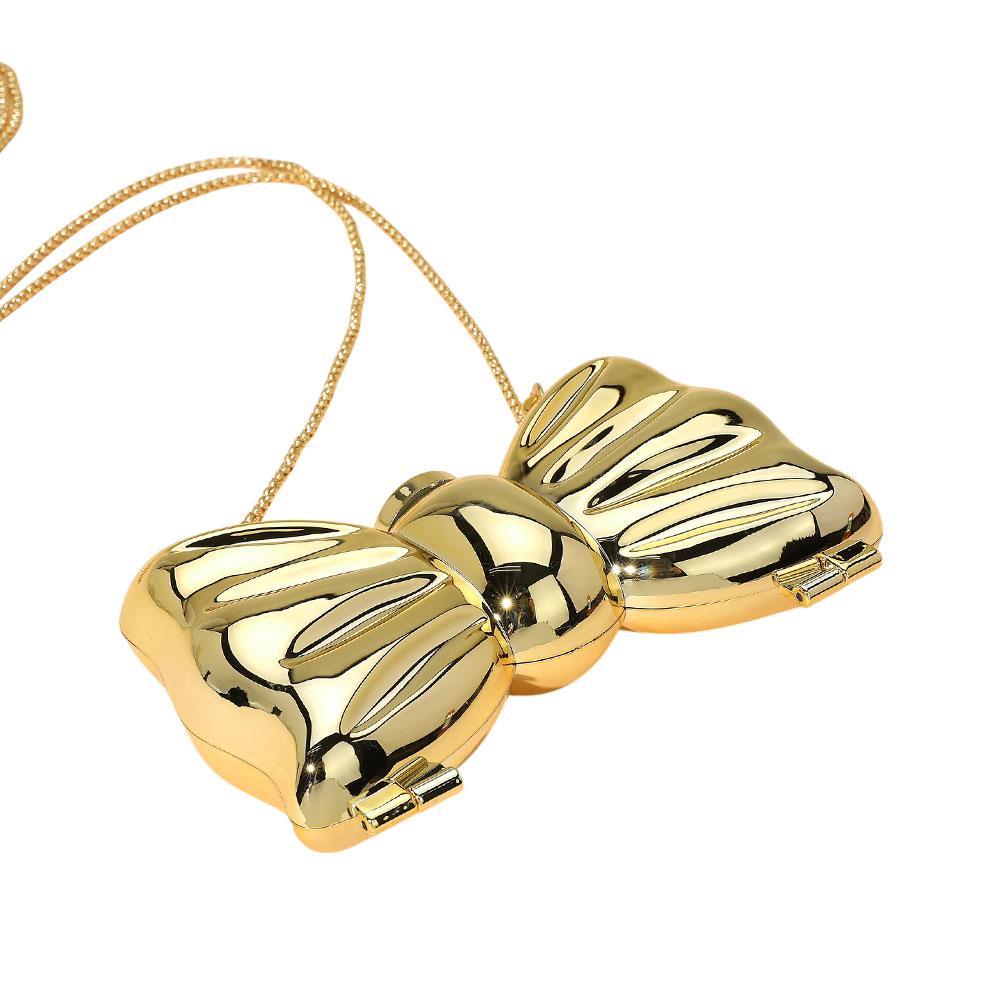 Details • Size : 5.5" X 3.5" X 1.5" • Strap Size : 46" L, Detachable • Clasp Closure • Mirror Inside • This bow-shaped clutch doubles as an elegant accessory and a practical beauty essential with built-in mirrors inside. Designed with a glossy hard case finish and chain strap, it’s perfect for parties, weddings, or nights out. The playful bow silhouette stands out while the functional mirrors make touch-ups effortless on the go. A compact yet stylish purse that blends charm, utility, and sophistication in one statement piece.