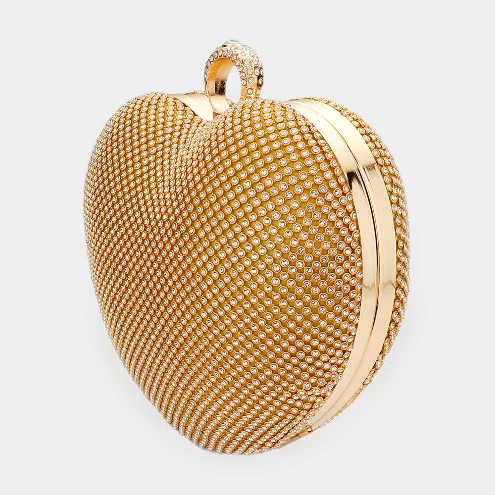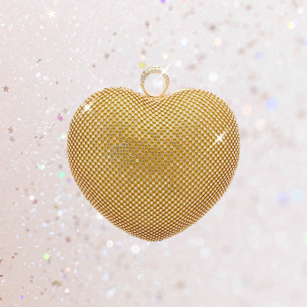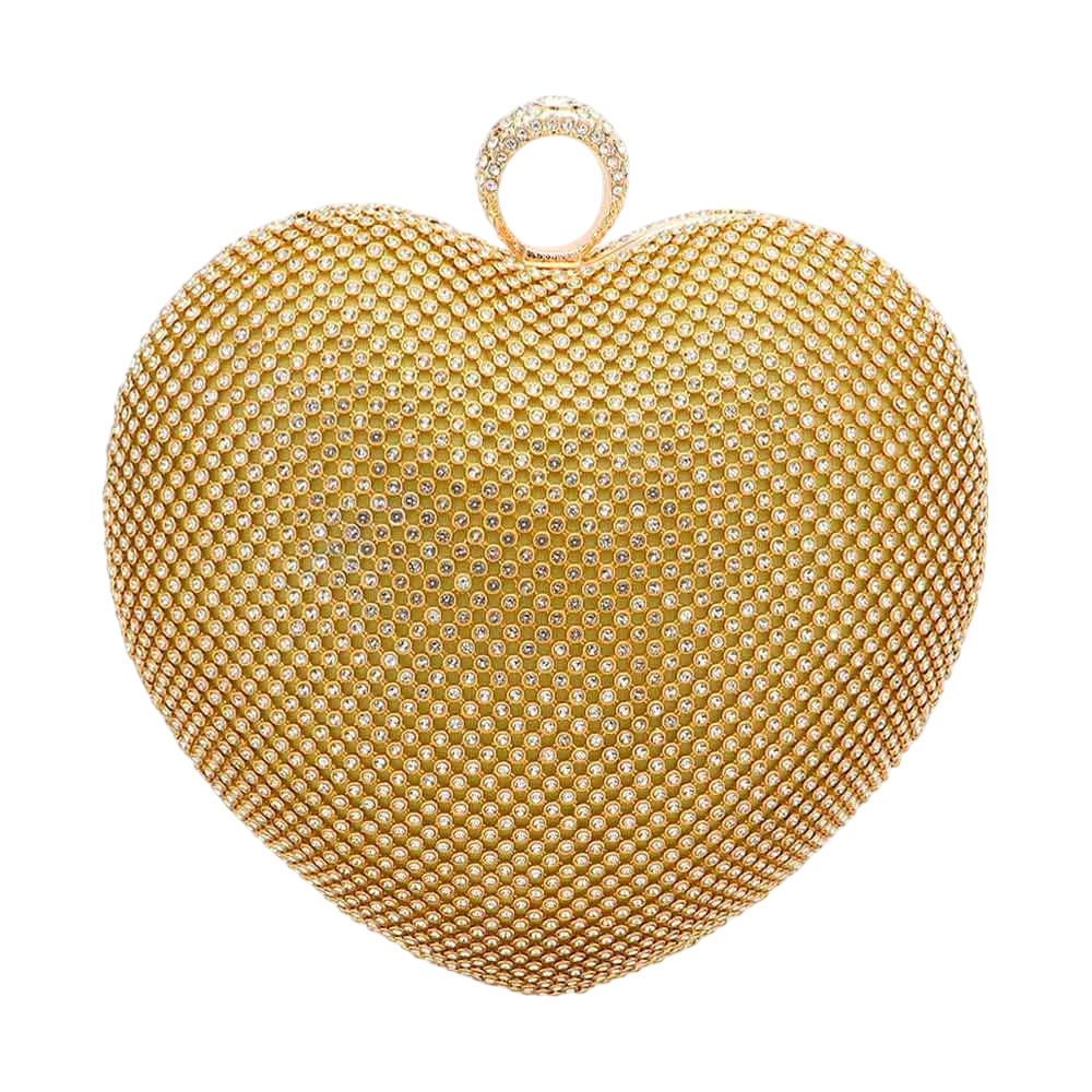 Details • Bag Size : 6.5" X 4" • Crossbody Chain Strap Size : 48" L, Detachable • No Inside Pocket • Clasp Closure • Add romance to your look with this dazzling heart-shaped clutch, designed with a sparkling textured finish and elegant closure. Perfect for parties, weddings, and evening outings, this chic purse brings a touch of glamour and charm to any special occasion.