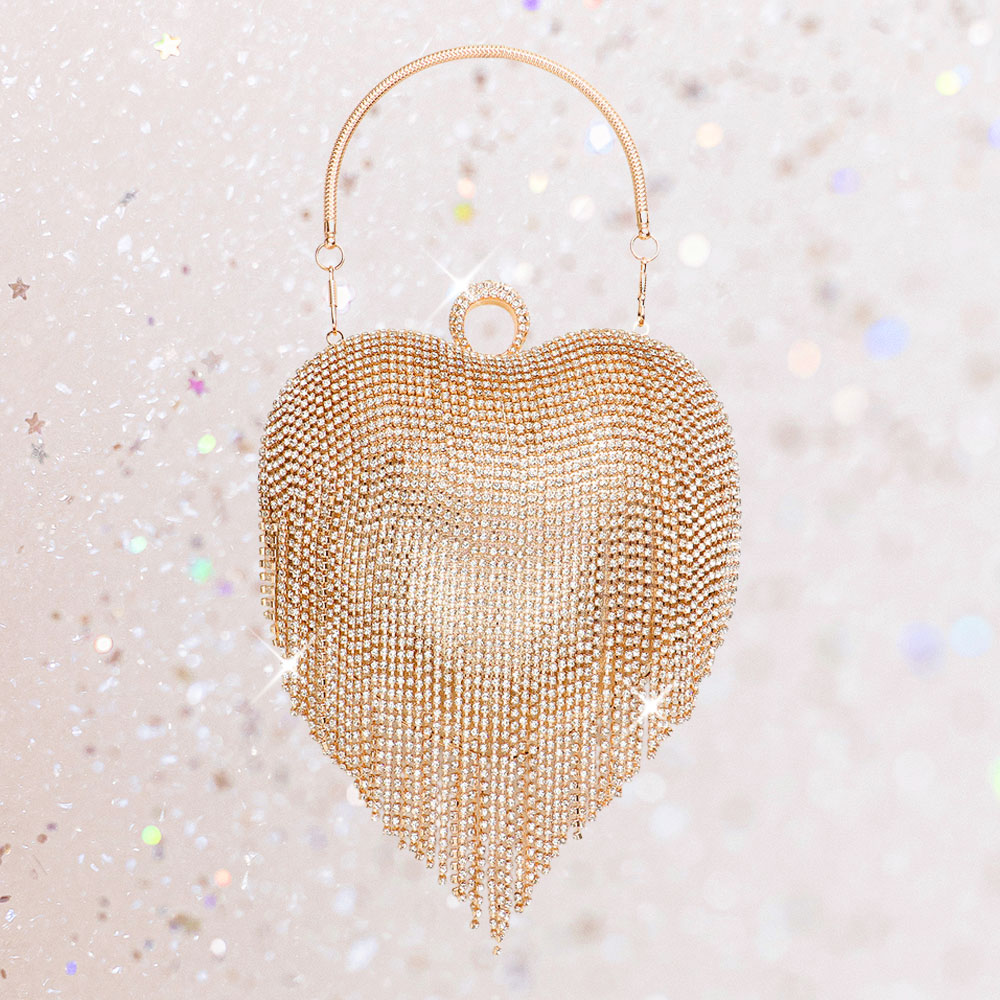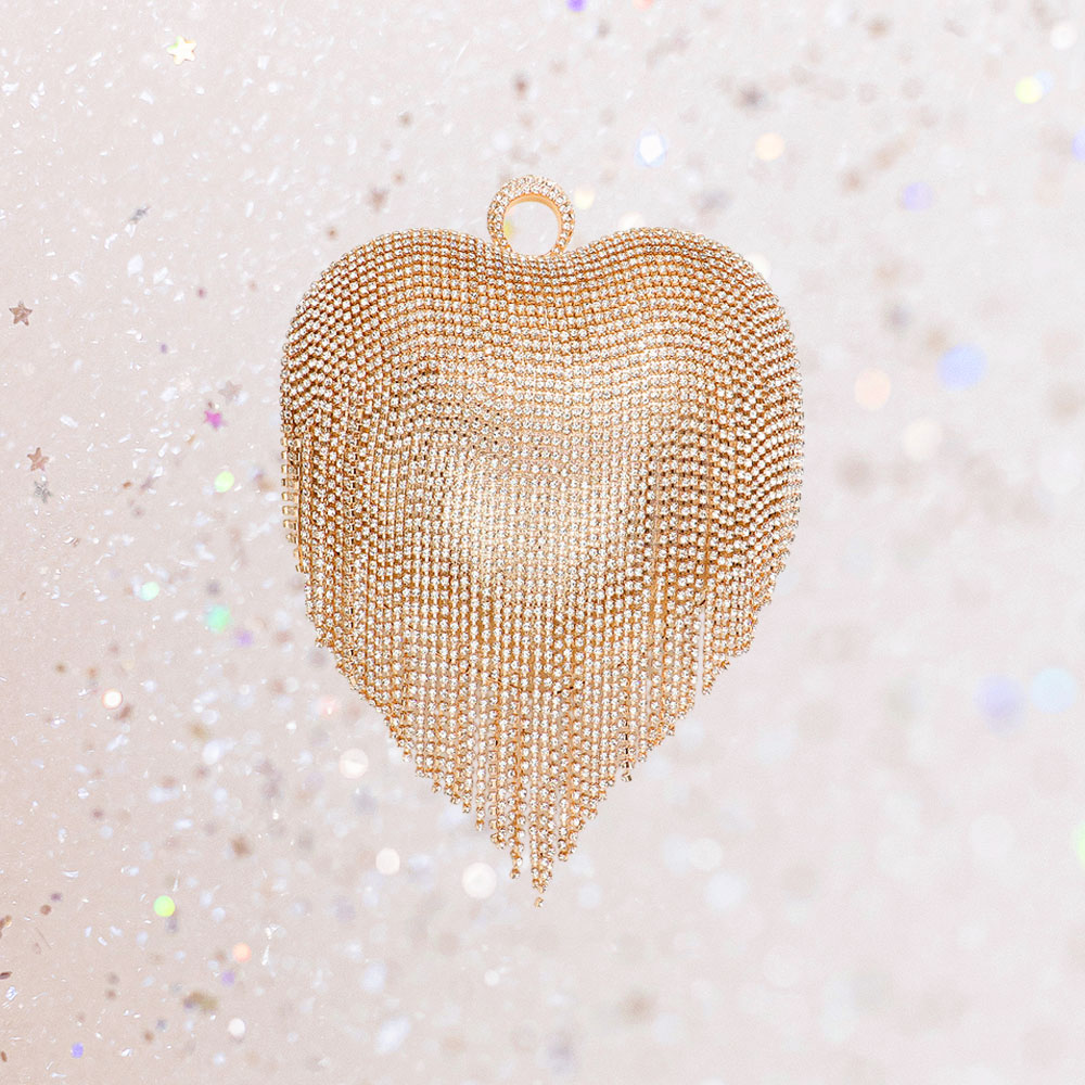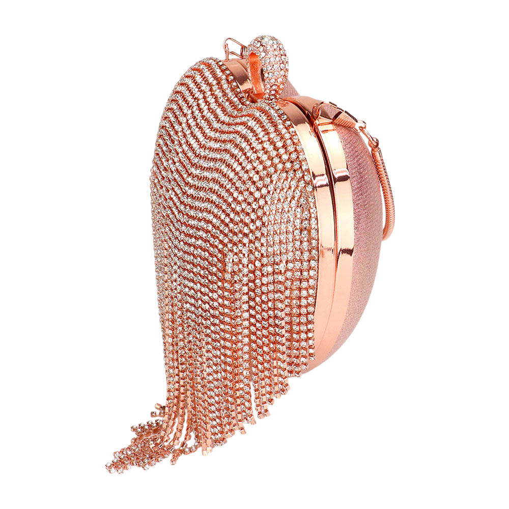 Details • Bag Size : 6.5" X 3.5" X 6.5" • Top Handle Size : 3" L • Chain Strap Size : 46" L (Detachable) • No Inside Pocket • Clasp Closure • Make a bold entrance with this glamorous heart-shaped clutch featuring cascading fringe details. Designed for parties, weddings, and evening events, this chic purse adds sparkle, movement, and elegance to any special outfit.