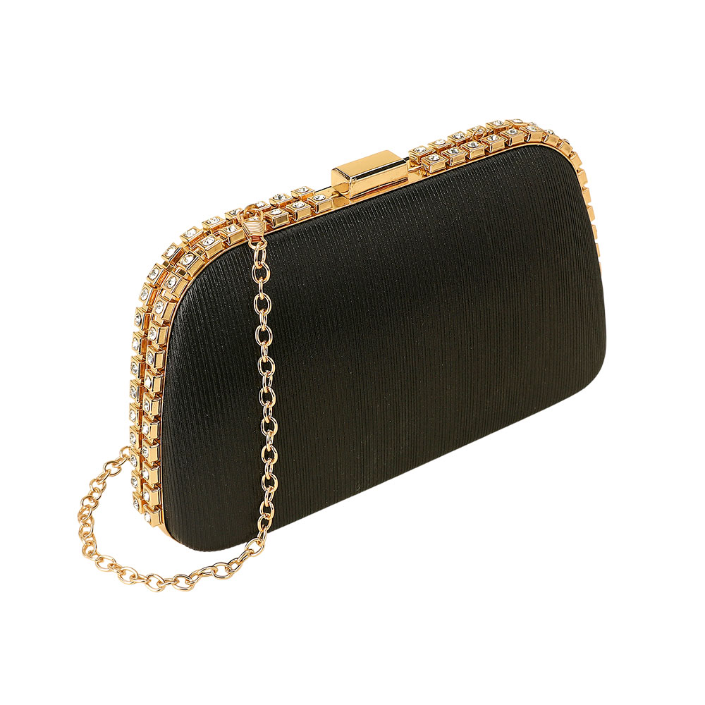 Details • Size : 8" X 4.25" X 1.5" • Strap Size : 46" L / Detachable • Clasp Closure • Chic evening clutch featuring a textured finish, shimmering rhinestone trim, and a detachable chain strap. Designed with a sleek clasp closure and gold-tone accents, this sophisticated handbag is perfect for weddings, parties, and formal events, adding timeless glamour to any outfit.